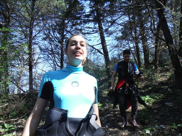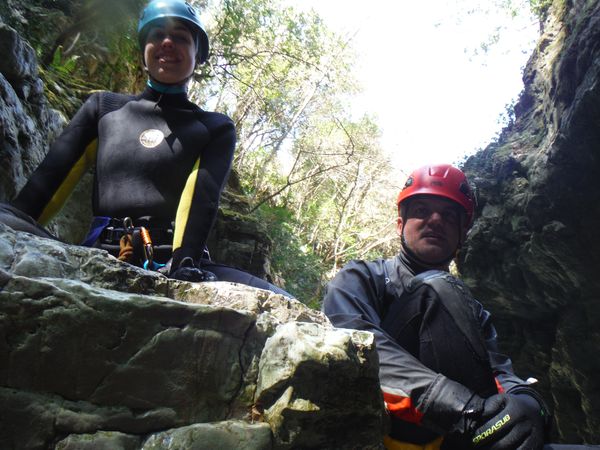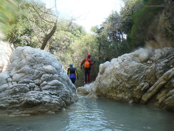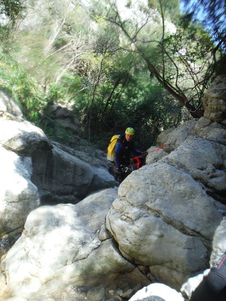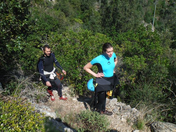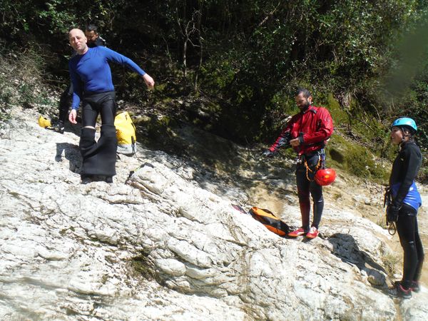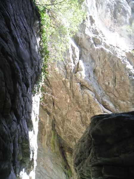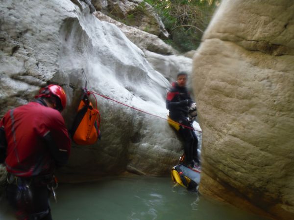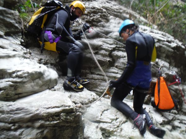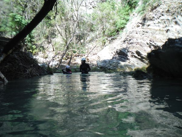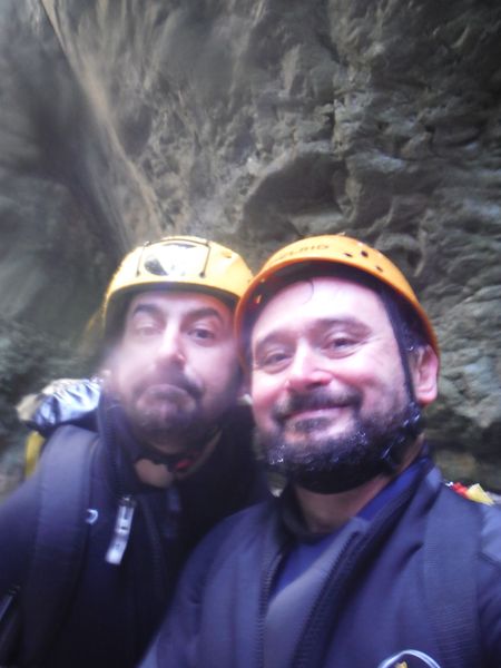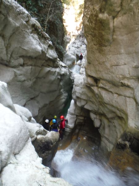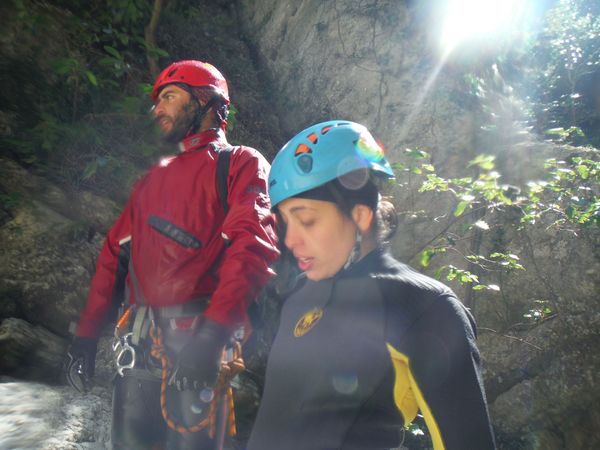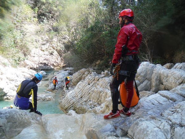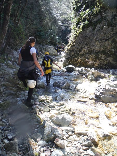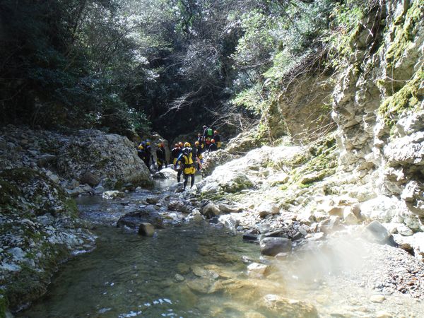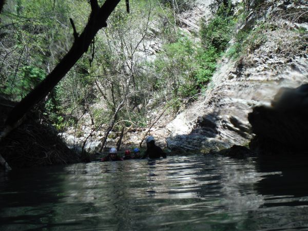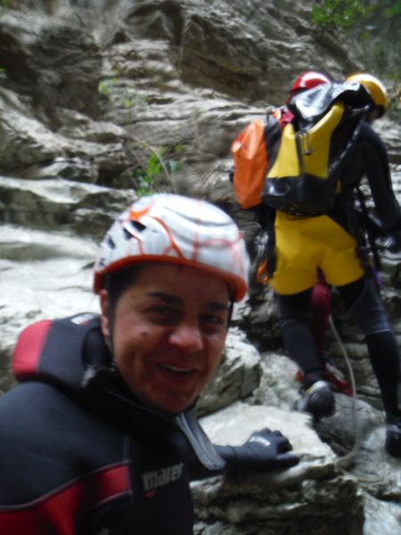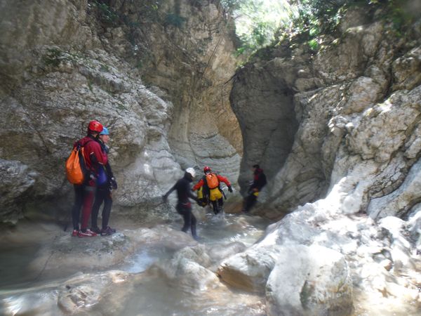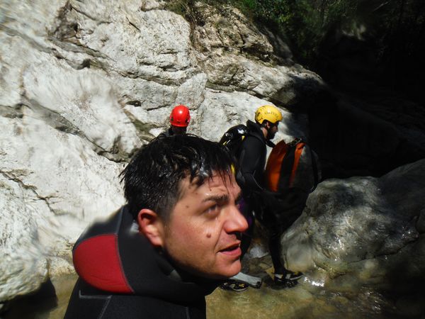 Subito dopo siamo in una zona in cui la forra si apre un po’. C’e’ anche della vegetazione. Simone, dalla fervida fantasia, decide che la zona e’ ottima per simulare una incursione modello marines ed inizia a chiamare a raccolta gli altri.