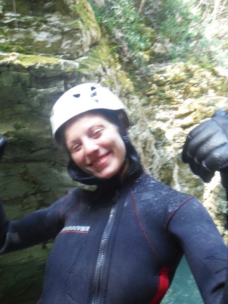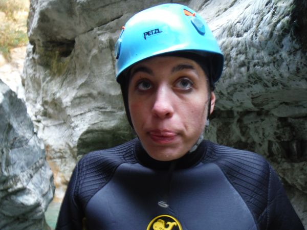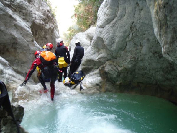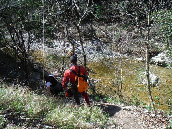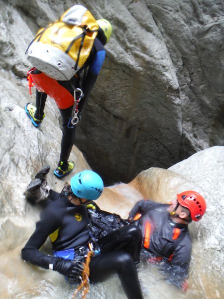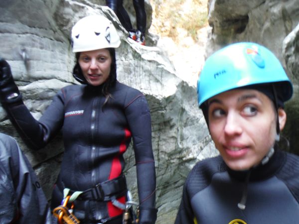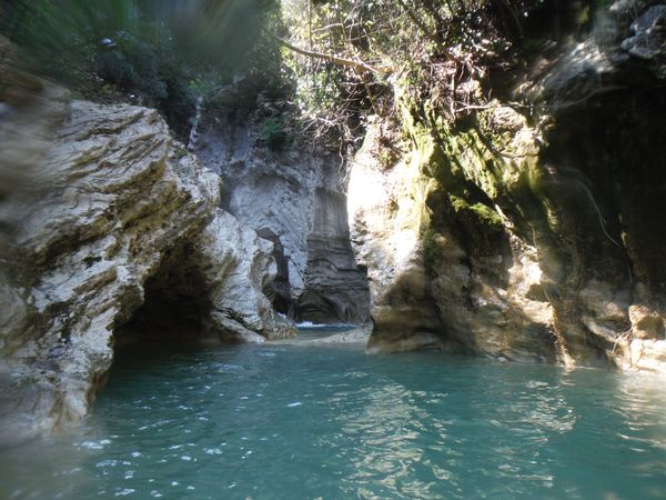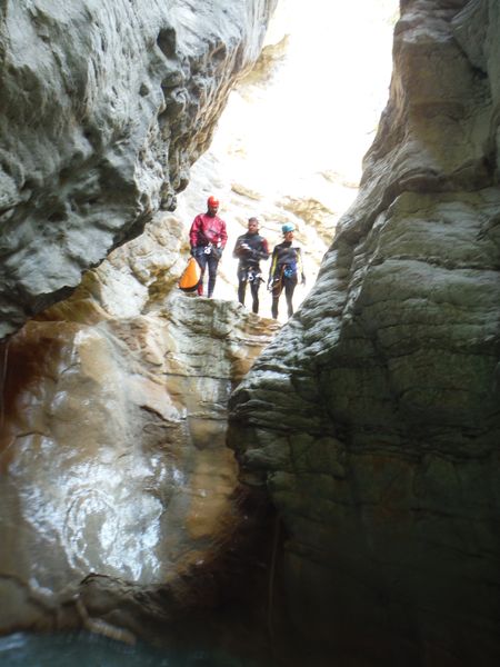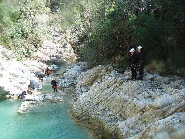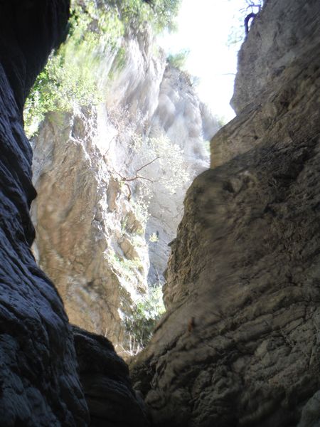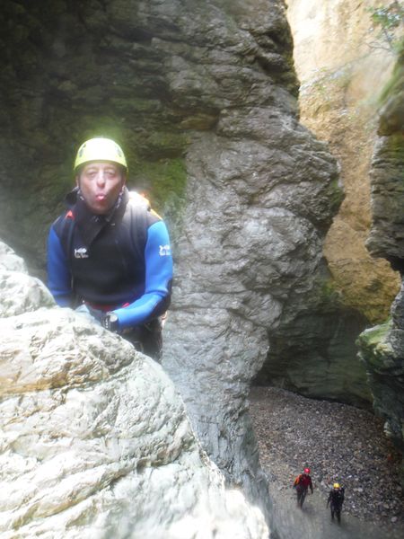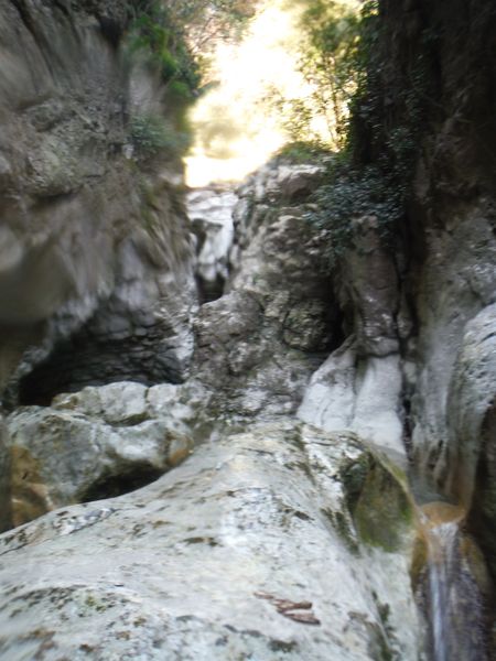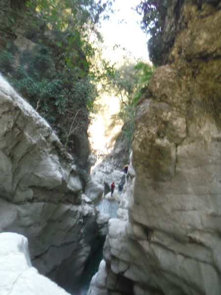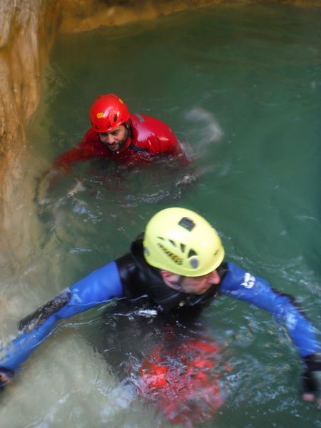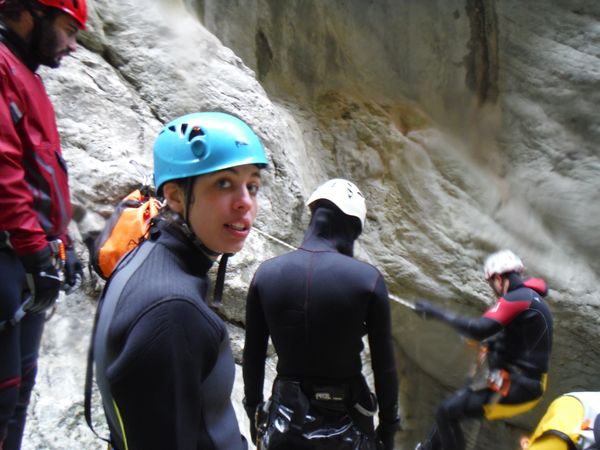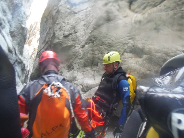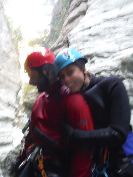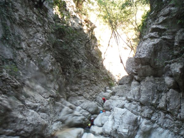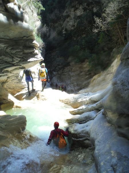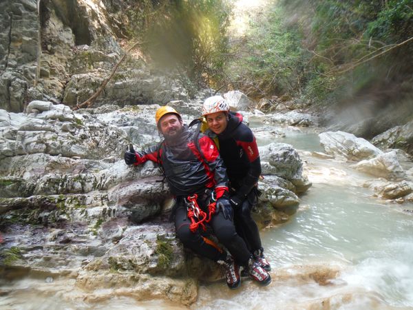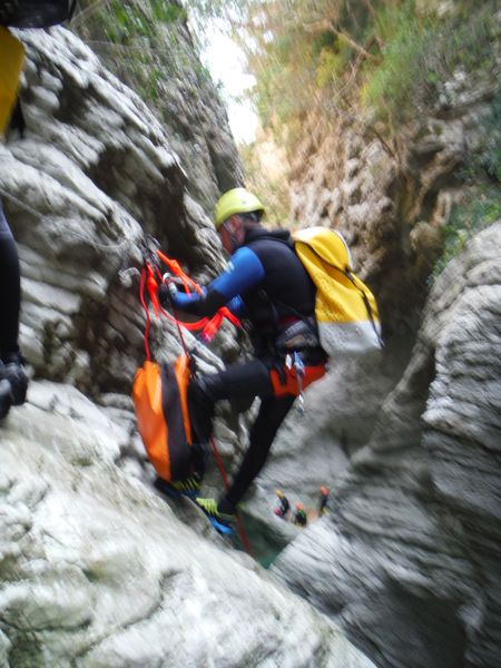 Subito dopo siamo in una zona in cui la forra si apre un po’. C’e’ anche della vegetazione. Simone, dalla fervida fantasia, decide che la zona e’ ottima per simulare una incursione modello marines ed inizia a chiamare a raccolta gli altri.