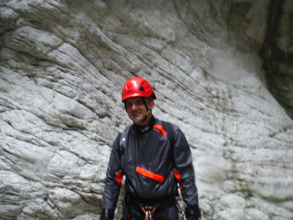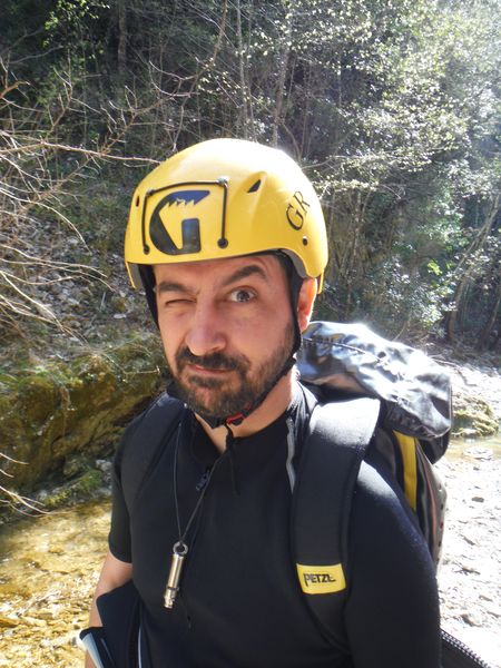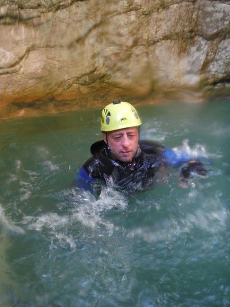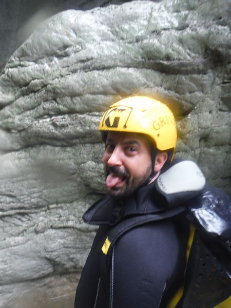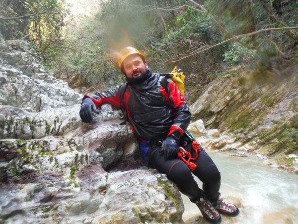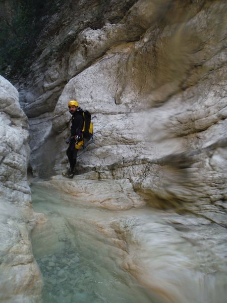 Il buon Fabrizio vicino al salto dove abbiamo visto il gruppo avanti a noi. E’ incredibile quanto l’acqua sia trasparente in alcuni punti. La pozza sotto i piedi di Fabrizio sembra vuota.