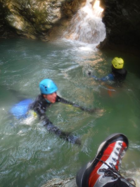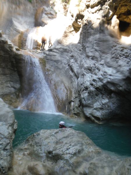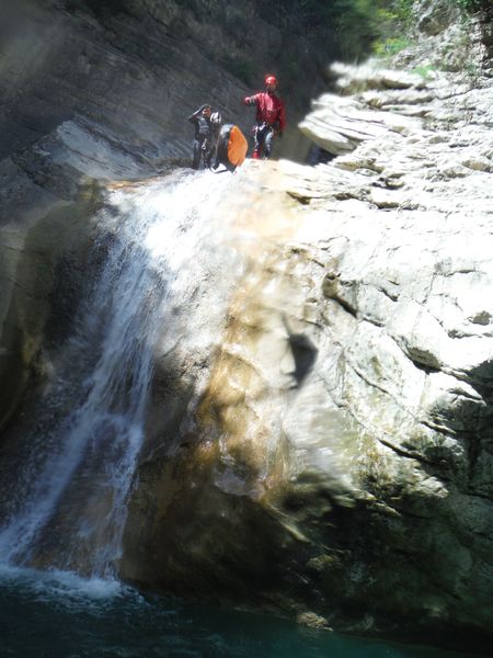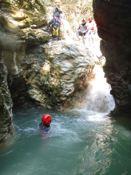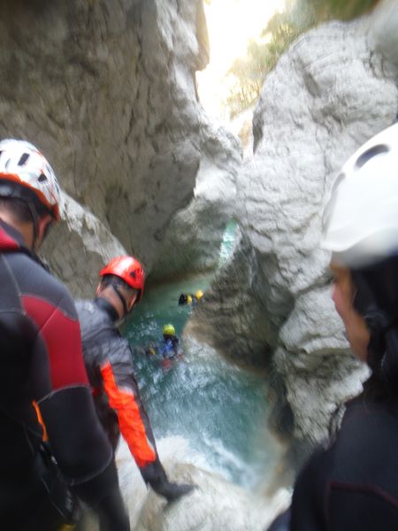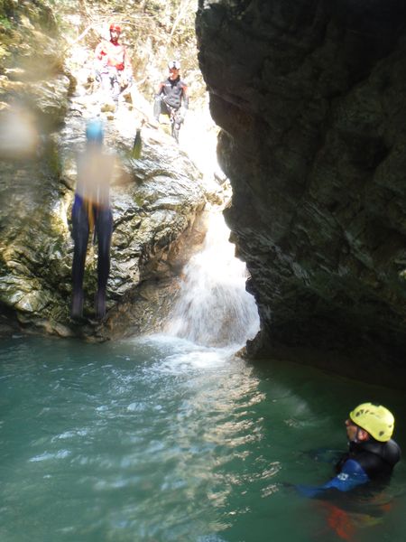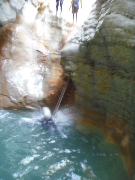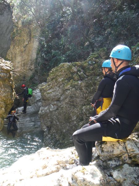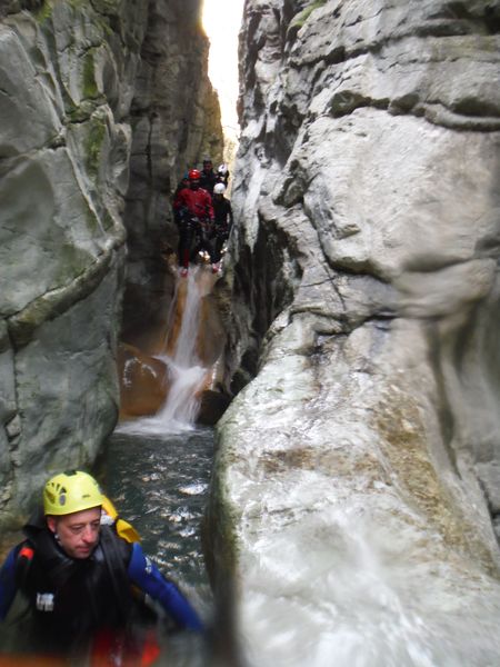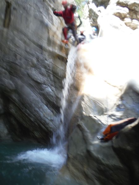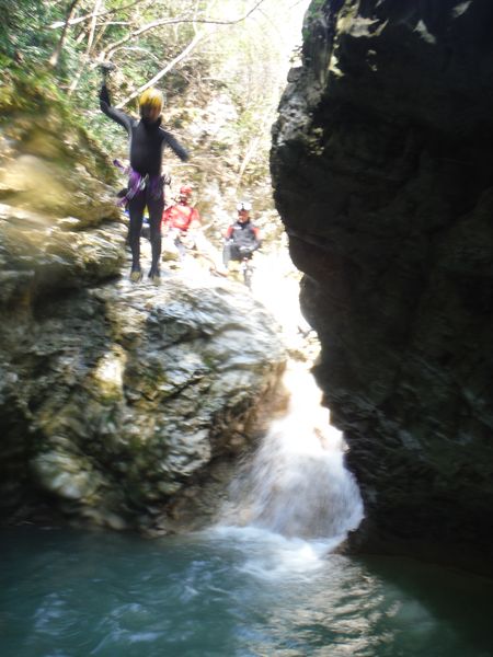 Il salto dopo la prima parte verticale prosegue con una serie di piccoli salti, quasi degli scivoli ma con molta acqua. Dopo, dove attendono i miei amici, c’e’ da saltare in una pozza. In fondo si vede Massimo che e’ gia’ andato avanti.