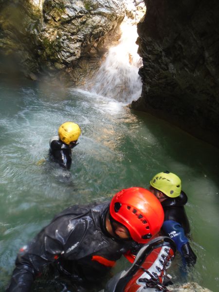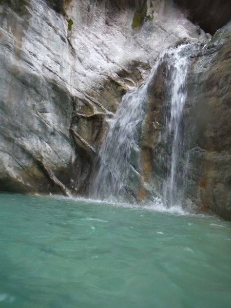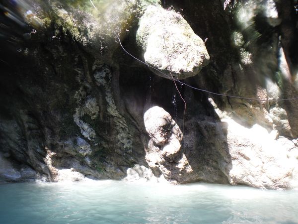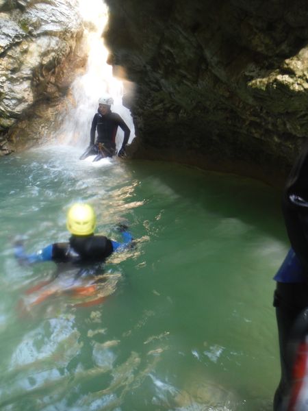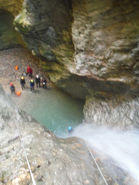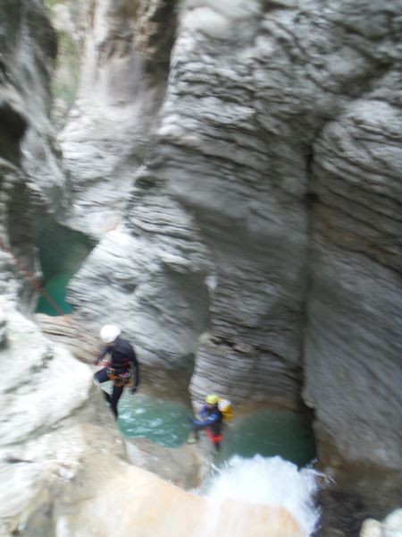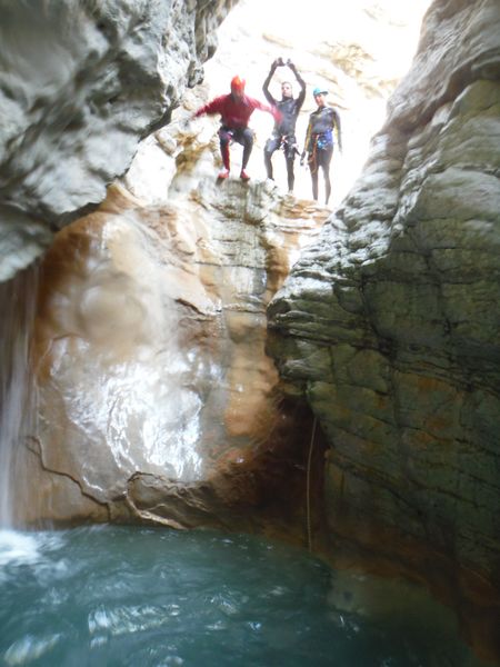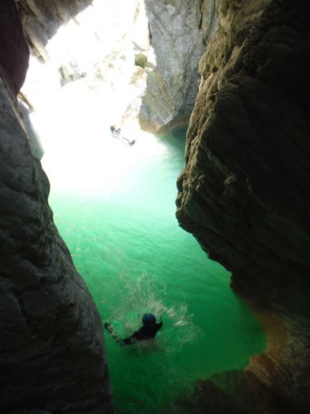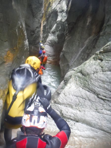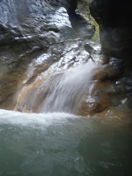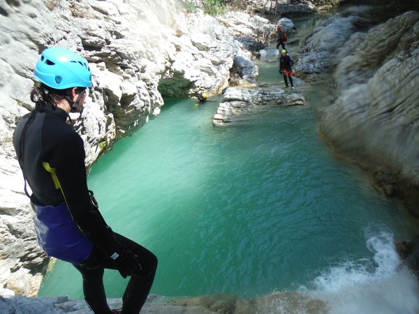 Il salto dopo la prima parte verticale prosegue con una serie di piccoli salti, quasi degli scivoli ma con molta acqua. Dopo, dove attendono i miei amici, c’e’ da saltare in una pozza. In fondo si vede Massimo che e’ gia’ andato avanti.