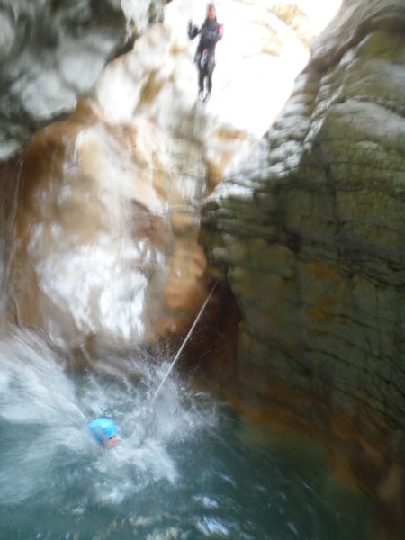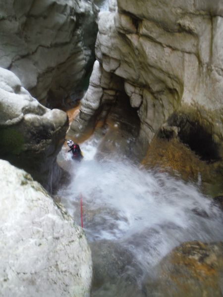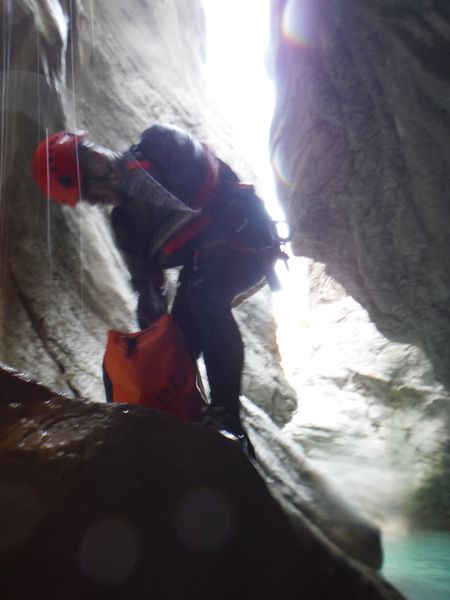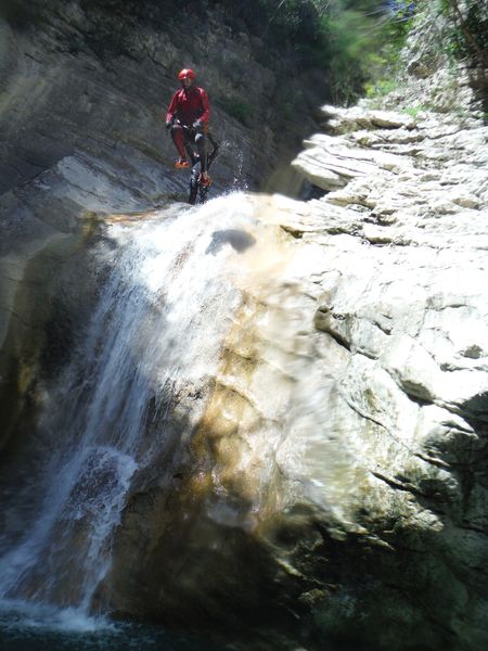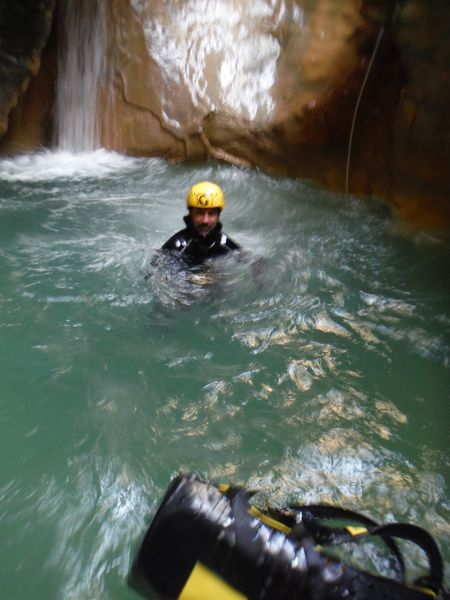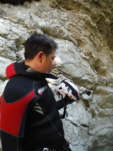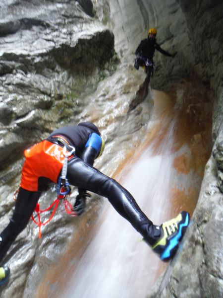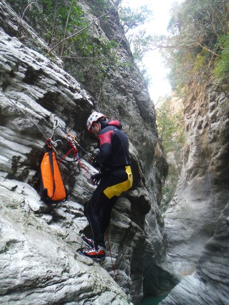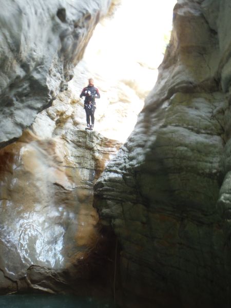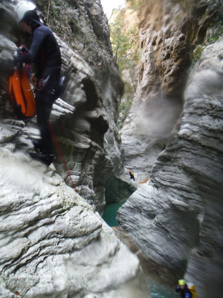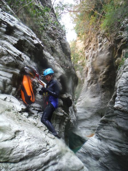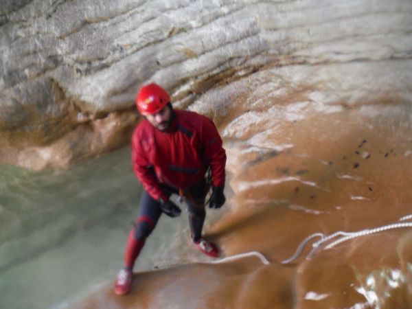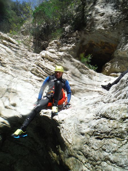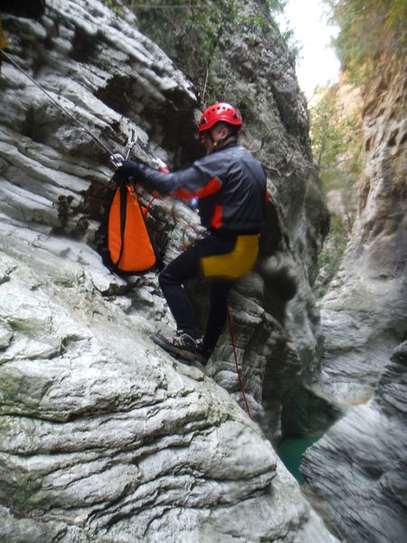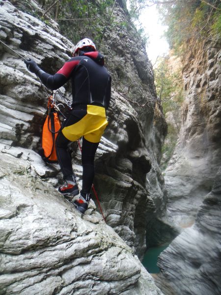 Proseguiamo senza fretta fino al salto successivo. Forse il piu’ alto di tutta la forra. Dell’altro gruppo avanti a noi nemmeno l’ombra, ci rivedremo per pochi secondi solo poco prima del termine della forra. Fabrizio si appresta a scendere.