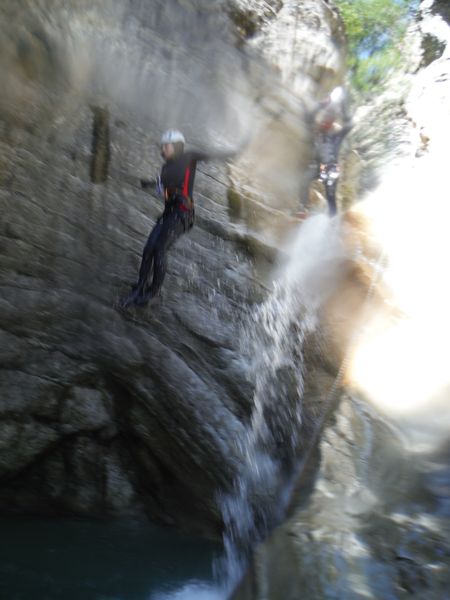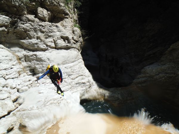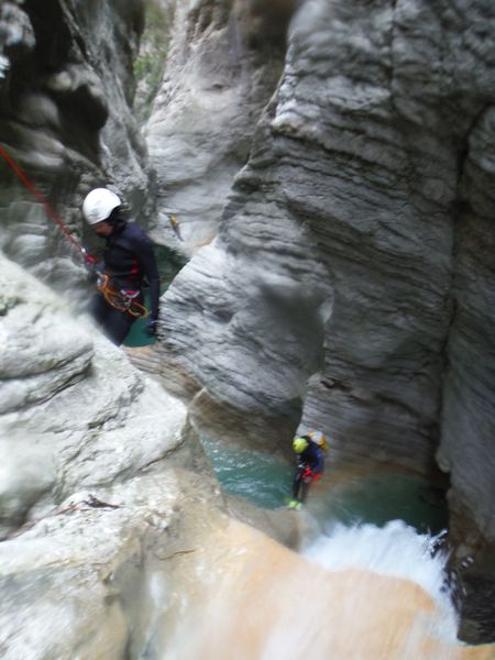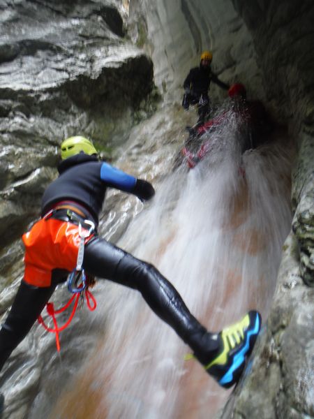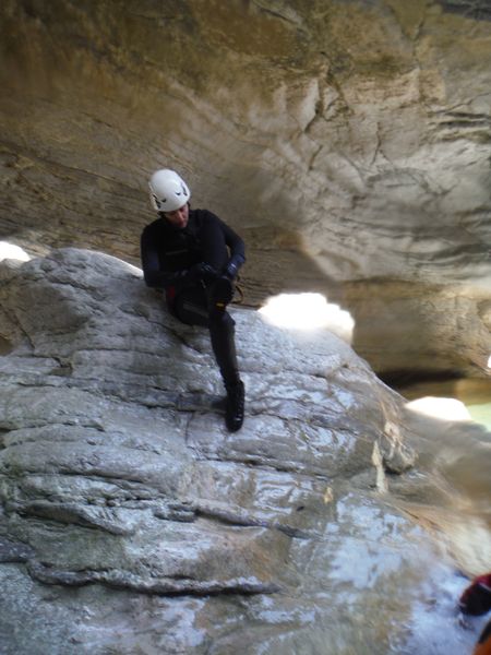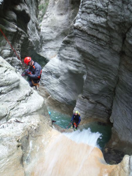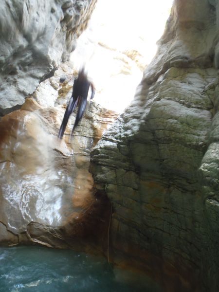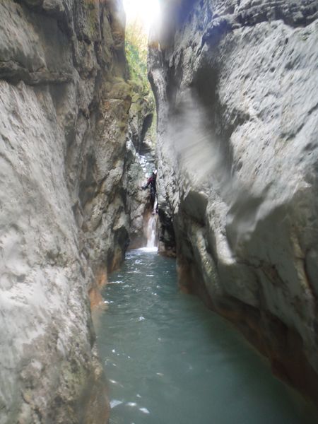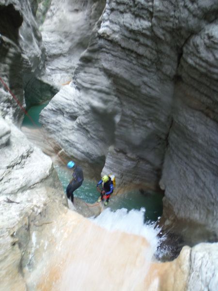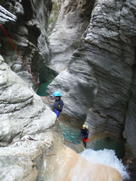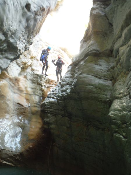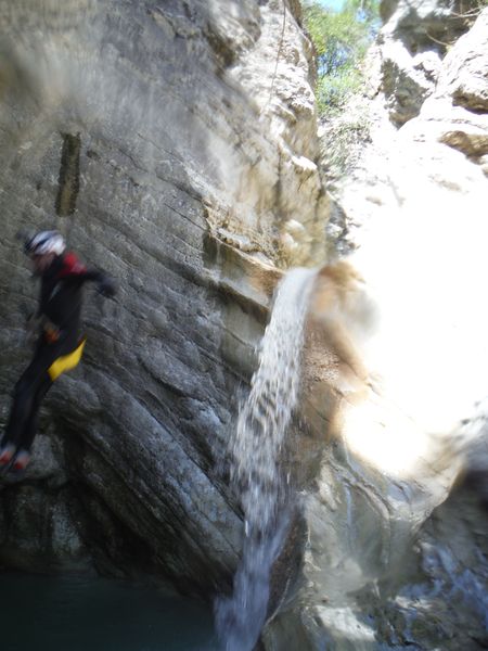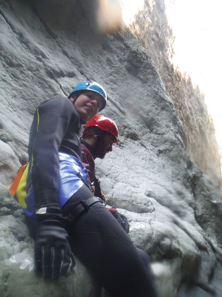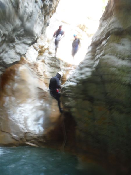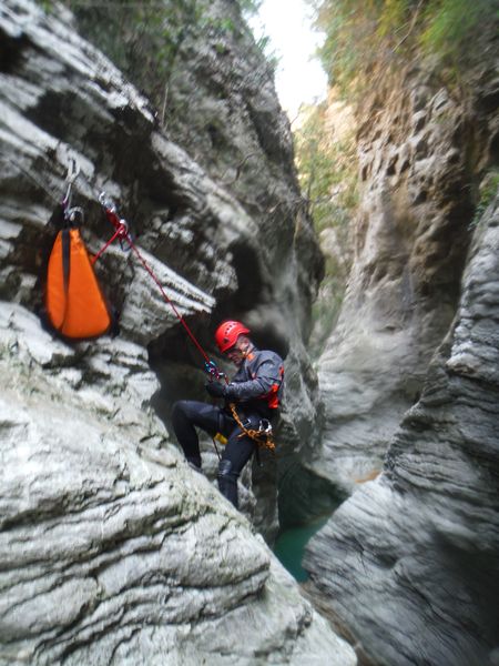 Proseguiamo senza fretta fino al salto successivo. Forse il piu’ alto di tutta la forra. Dell’altro gruppo avanti a noi nemmeno l’ombra, ci rivedremo per pochi secondi solo poco prima del termine della forra. Fabrizio si appresta a scendere.