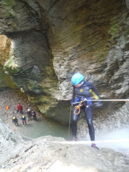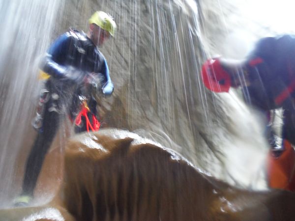 Buon ultimo scendo anche io. Claudio e Massimo mi aspettano sotto la cascatella per aiutarmi a sistemare la corda.