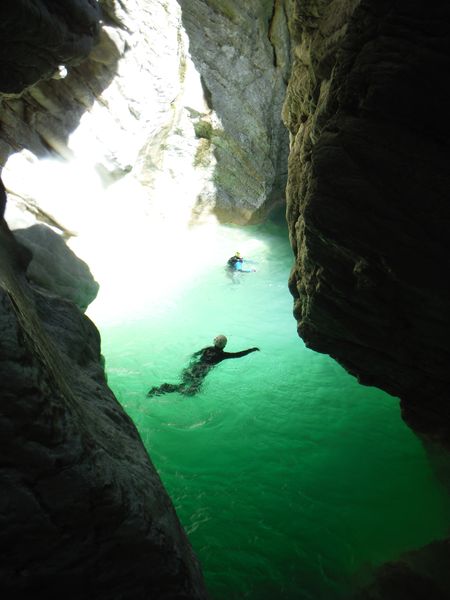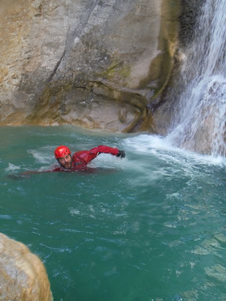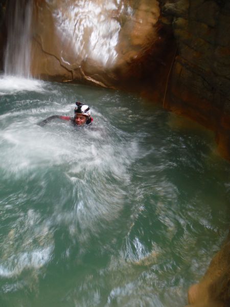 Gli altri, meno invadenti di me, si tengono in disparte. Il gruppo che ci precede passa il primo salto abbastanza velocemente. Li lascio in pace e mi immergo in una pozza per raffreddarmi un po’ e stemperare l’impatto con l’acqua nel salto che mi appresto a fare.