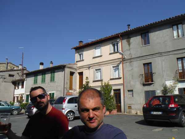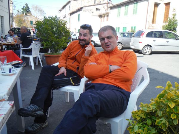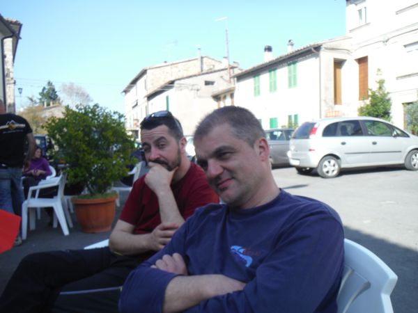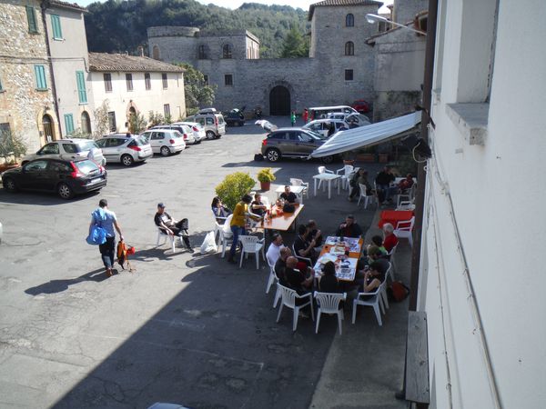 Ancora qualche metro di salita e siamo alla piazza grande di Prodo. Prendiamo i nostri vestiti asciutti dalle macchine e saliamo alla scuola per cambiarci. Al bar ci sono tavolate di forristi intenti a rifocillarsi dopo le fatiche, li riprendo dalla finestra della scuola.