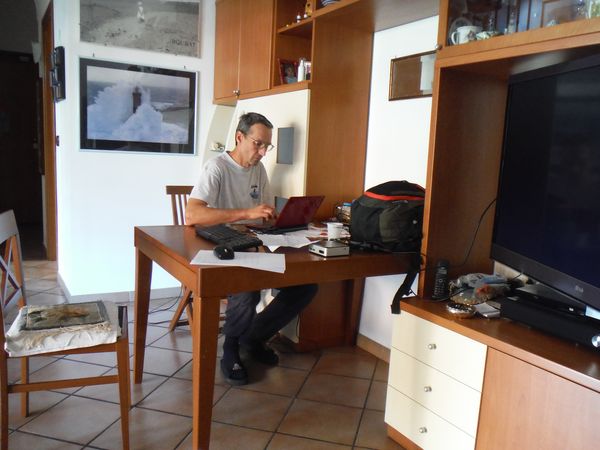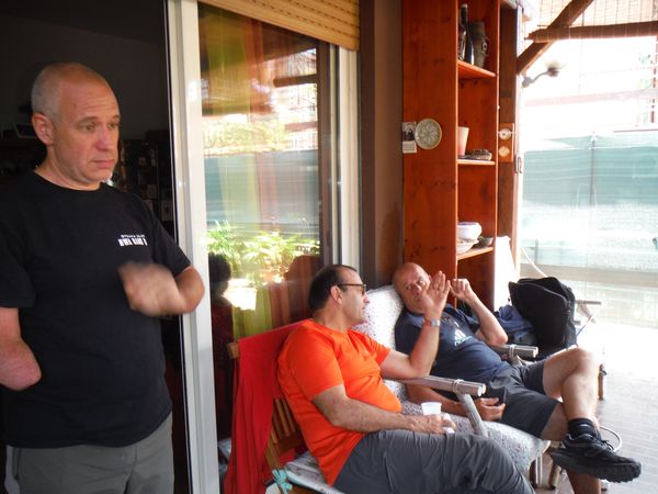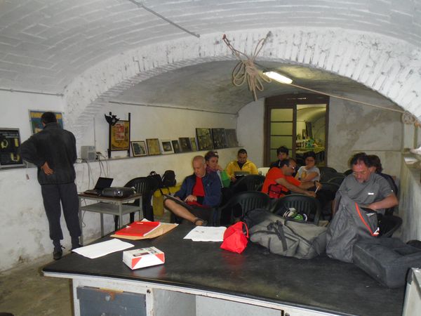 Ma ora iniziamo sul serio a rivivere assieme le 2 splendide giornate. La mattina di Sabato inizia benissimo per me, Maria e Gianni vengono a prelevarmi sotto casa. Li aspetto in compagnia del solito, enorme, zaino arancione. In teoria oggi non dovrebbe servire la tuta e gli altri ammennicoli che affollano lo zaino, pero’ li porto perche’ “non si sa mai”! Arriviamo in orario alla sede dello SCR ma poi dobbiamo fare dei lunghi giri per cercare parcheggio. Alla fine troviamo un buco nell’enorme ed inzeppatissimo parcheggio dietro la fermata della metro. Un buon caffe’ al bar davanti la sede, con molti dei convenuti, ci riconcilia con la giornata. Scendiamo alla sede per prepararci ed aspettare i ritardatari. Marco inizia a prepararsi alla lezione.