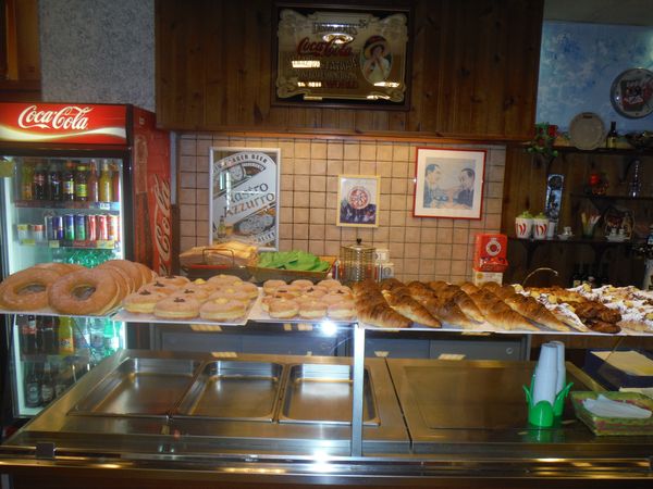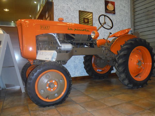 Dopo lo sforzo documentativo nulla piu’ mi trattiene, entro. Anche nel bar ci siamo solo io ed il gestore. Un rapido saluto e poi mi approprio di una enorme ciambella e ne inizio la distruzione. Tanto per darmi un tono faccio una foto al fantastico trattore che campeggia nel bar. Il gestore, notando il mio interesse mi racconta che il trattore lo compro’ suo padre quando lui nacque, hanno la stessa eta’. Lo ha fatto restaurare e ne e’ giustamente molto orgoglioso. Inizia ad arrivare anche qualche altro avventore e la nostra tranquilla chiacchiera si spegne.