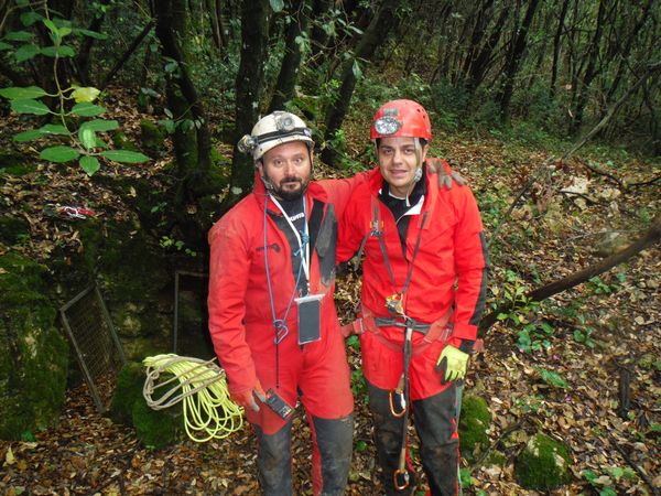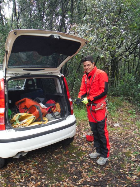 Fa capolino il buon Giulio, anche con lui e’ tanto che non ci si vede. Ci aggiorniamo a vicenda. Gli racconto che sto aspettando Giuseppe e Simone per andare al Pretaro a provare il DistoX. Lui e’ in attesa di altri amici per andare alla forra di Prodo. Lo rimprovero bonariamente per non averci avvertito di questa gita. Sono interrotto dal telefono che squilla. E’ Simone. Mi dice che si e’ appena svegliato ed e’ ancora ad Orvieto. Mi predispongo mentalmente ad una lunga attesa e mentre parlo con lui penso a come impegnero’ il tempo…ma eccolo che spunta nella piazza del bar! Quel burlone come suo solito mi stava facendo uno scherzo! Giulio ci offre la colazione. Mentre si chiacchiera allegramente assieme il buon Giulio ci propone di cambiare la nostra destinazione abbandonando il Pretaro per andare a Roccarello. Sia Simone che io non l’abbiamo mai visitata quindi la proposta riscuote la nostra approvazione. C’e’ un problema pero’, non saprei proprio ritrovare l’ingresso. Giulio si offre di guidarci lui. Loro partiranno piu’ tardi e ha tutto il tempo. Guardiamo l’ora, le 8, orario dell’appuntamento sono abbondantemente passate. Questo vuol dire che Giuseppe, solitamente puntualissimo, ci ha dato buca. DEcidiamo quindi che e’ ora di partire. Salutiamo Tiziana e Roberto ed usciamo. Giulio conferma la sua offerta di farci da guida. E’ andata, abbandoneremo il Pretaro a favore di Roccarello. Giulio prende la sua macchina, noi lo seguiamo su quella di Simone. Arriviamo a Calvi, perdiamo di vista Giulio ma sono sicuro del percorso fino all’imbocco della strada che si inoltra nel bosco dopo il cimitero. Simone sale mentre lo guido tra i vicoli di Calvi. Quando inizia la strada del bosco, Giulio non si vede ancora. Pensiamo sia andato avanti e proseguiamo. Dopo circa un chilometro, di Giulio nemmeno la traccia. Ci fermiamo per chiamarlo. Per fortuna il telefono prende e possiamo parlarci. Lui aveva preso una “scorciatoia” fermandosi poi ad aspettarci. Non ci siamo incrociati. Gli diciamo che noi siamo andati avanti. Ci fermiamo ad aspettarlo ed in un minuto lo vediamo comparire. Proseguiamo assieme. Non ricordavo proprio tutta quella strada per raggiungere la grotta. Calcolo che dal bivio del cimitero sono almeno 3 chilometri. Ad un anonimo spiazzo sulla destra il buon Giulio si ferma, siamo arrivati. Peccato non avere il GPS per prendere il punto, non so se lo ritrovero’ mai senza un aiuto! Giulio ci accompagna all’ingresso della grotta e facciamo ancora qualche chiacchiera. Giulio ci descrive brevemente Roccarello e la temibile strettoia verticale che ci aspetta. Dice che farebbe comodo mettere una corda sulla strettoia ma noi non l’abbiamo. Ma non c’e’ problema! Ce la presta Giulio. Tira fuori dalla macchina una bella corda giallo fosforescente, cerchiamo di rifiutare, sarebbe un peccato infangarla ma lui e’ irremovibile e ce la affida. E’ arrivato il momento di lasciarci. Ancora un giro di saluti ed abbracci poi Giulio sale in macchina e noi iniziamo a prepararci. Simone cerca di prendere il punto GPS col cellulare ma sembra che non riesca ad agganciare i satelliti, rinunciamo.