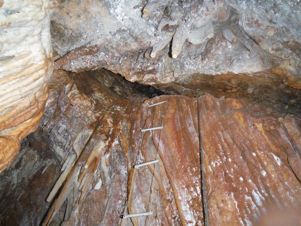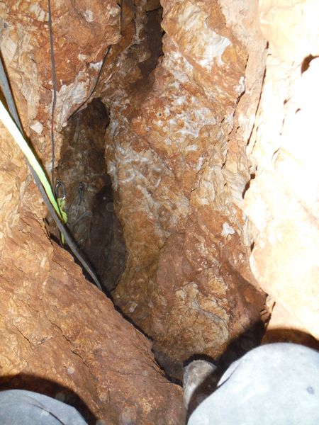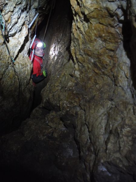 Scendo la strettoia. Facendo onore al suo nome, e’ ben stretta, pero’ in discesa non e’ un grosso problema. Dopo meno di 2 metri di stretto si arriva gambe nel vuoto nella saletta sottostante. La scaletta risulta utile per arrivare alla base senza inventarsi pericolose arrampicate. Aggiorno Simone su quel che lo aspetta e gli consiglio di limitare al minimo indispensabile i punti presi quando e’ nella strettoia.