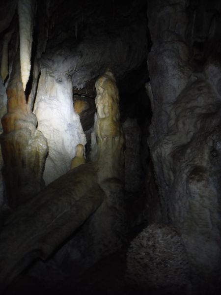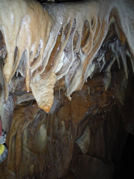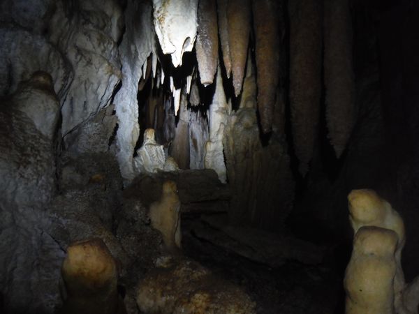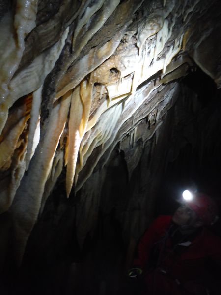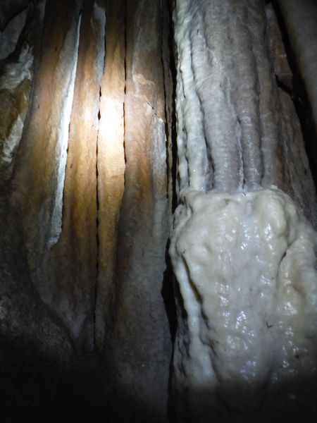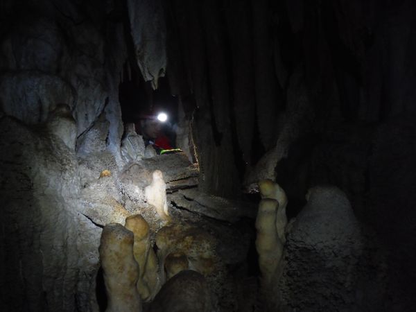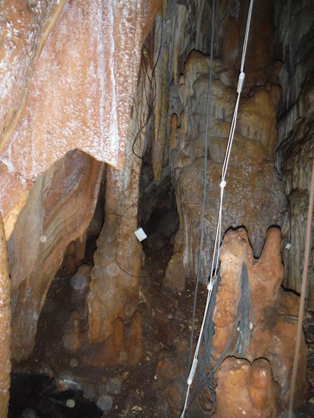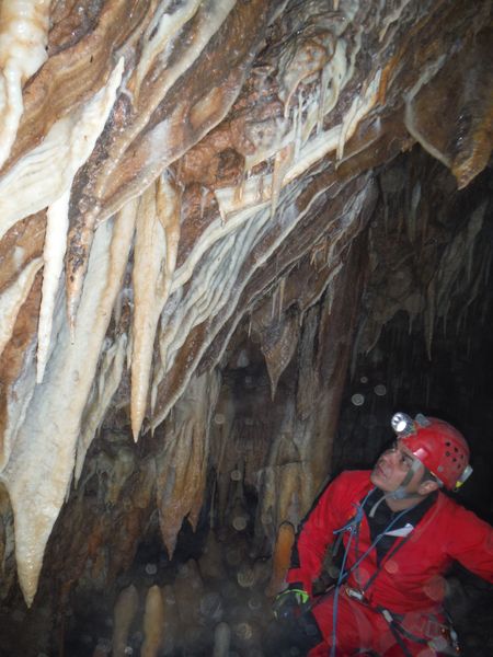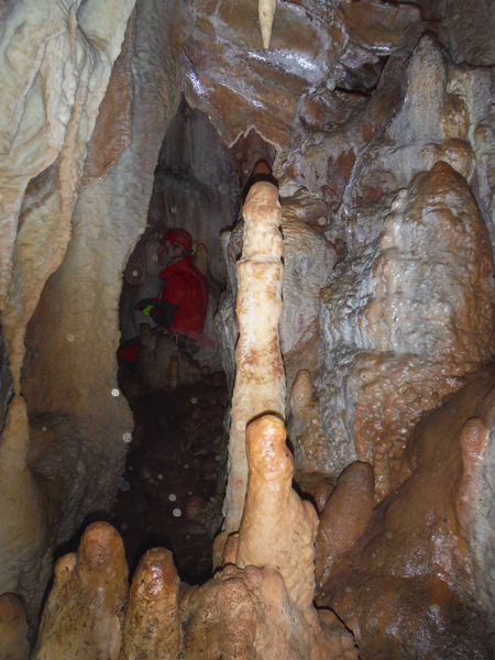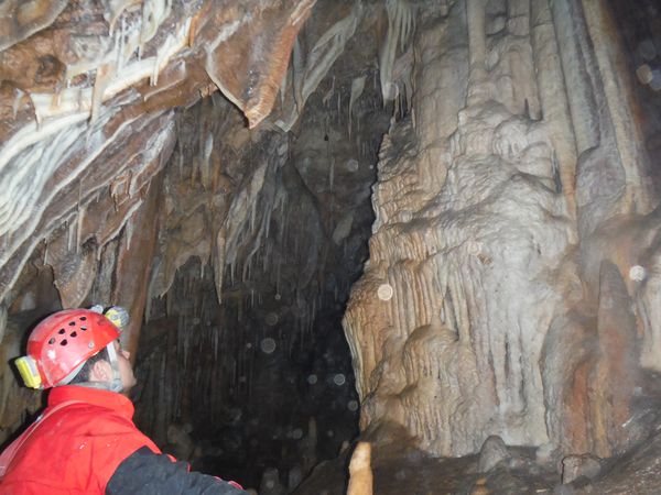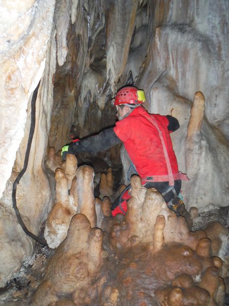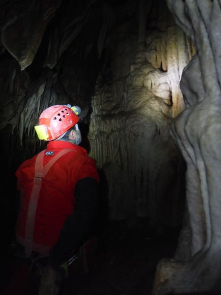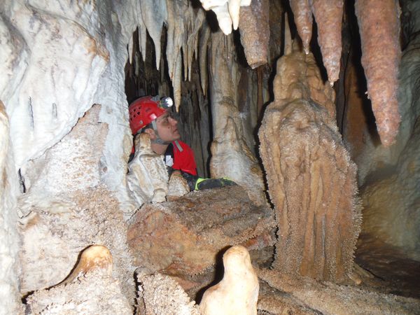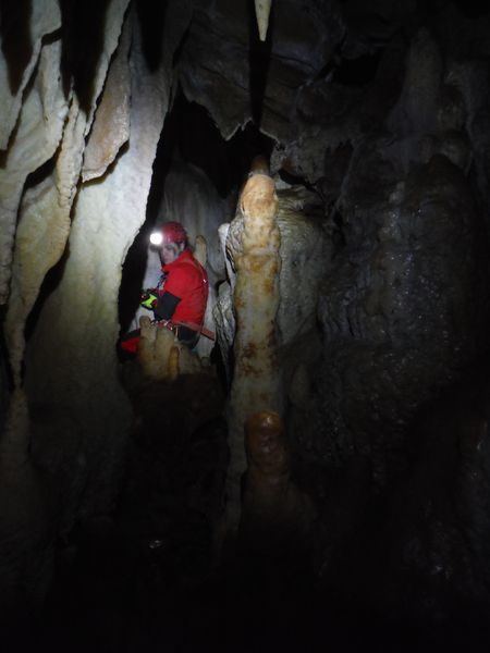 Proseguiamo il rilievo con le solita foto di accompagno. Dall’ultima sala torniamo indietro girando verso destra e ci ritroviamo nella penultima sala. Quella che all’andata ci era sembrata la parete della grotta si rivela essere una enorme colonna. Io torno indietro per la via fatta poc’anzi mentre Simone termina di “sparare” i punti.