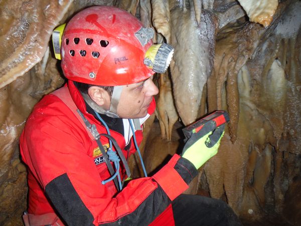 Prima di partire per l’avventura faccio a Simone un rapido spiegone su come funziona il distox in accoppiata col palmare e decidiamo come dividerci i compiti. Simone governera’ il distox ed io mi occupero’ del palmare. Iniziamo prendendo il punto ‘0’ direttamente sulla grata metallica. Gia’ al caposaldo successivo mi accorgo che si tratta di una falsa partenza. Riesamino con la memoria a quanto abbiamo appena fatto. Evidentemente la grata ha influenzato la bussola e le direzioni sono platealmente sballate, come ho fatto a non pensarci prima?!?. Usciamo di nuovo fuori. Spiego il problema a Simone e gli faccio vedere i punti scaricati sul palmare che lo dimostrano. Apro un nuovo rilievo e ricominciamo. Stavolta prendiamo il punto iniziale fuori dalla grotta, ad un paio di metri dalla grata. Vado avanti a dare uno sguardo alla strettoia verticale che ci attende un paio di metri piu’ in la’.