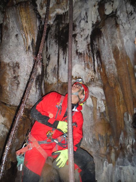 Sistemo la corda gialla di Giulio e mi giro verso Simone per continuare col rilievo. Guardando meglio vedo che in corrispondenza della strettoia c’e’ la scaletta di cui ci parlava Giulio ma anche una corda fissa. La corda di Giulio si puo’ risparmiare la sporcata, la tiriamo da parte e proseguiamo.