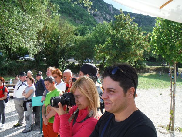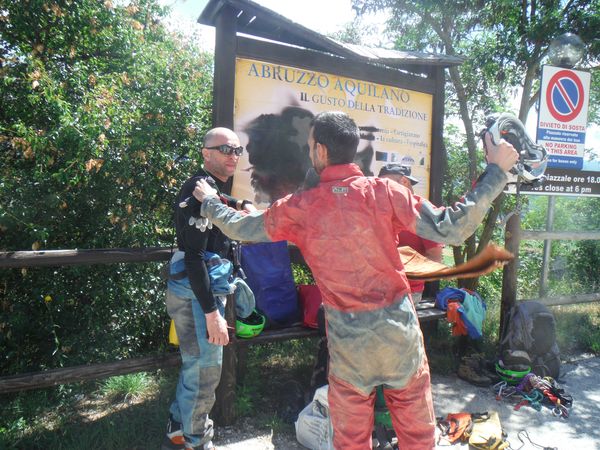 Diversamente Speleo, stavolta si tiene a Stiffe. E’ la prima volta che partecipo a tale manifestazione e ne sono contento, ancor di piu’ perche’ anche Betta si e’ convinta a venire. Dobbiamo essere a Stiffe alle 8.30 quindi si parte prestino. Abbiamo appuntamento con Claudio e Matteo alla prima area di servizio dopo il casello della Roma-L’aquila. Noi ci arriviamo con buon anticipo e manco a farlo apposta ci incontriamo con Maria e Gianni anche loro diretti a Stiffe. Dopo i saluti con loro ed un buon caffe’ gentilmente offerto da Gianni, ci predisponiamo all’attesa dei nostri amici. Vado a fare il pieno, poi porto Luna sul prato a fare i bisogni. Mentre Luna strappa fili d’erba (si, ho una cana ruminante, ama l’erbetta fresca!) mi godo il sole. Chiamo Simone che e’ partito stamane da Orvieto ed ora e’ a Magliano Sabina in attesa di Giulio e gli altri amici di Montebuono. Rinnoviamo l’appuntamento di massima all’uscita L’aquila Est e ci lasciamo. La nostra attesa termina con l’arrivo di Claudio e Matteo. Dopo saluti e caffe’ siamo pronti per partire. La strada non e’ pochissima pero’ e’ tranquilla e soleggiata, vado avanti io per tutto il tratto di autostrada. Poco prima di arrivare alla nostra uscita vedo la macchina di Claudio deviare per un’area di servizio, probabilmente deve fare rifornimento. Fuori dall’autostrada cerco uno spiazzo dove fermarmi ma trovo nulla. Cerco tracce di Simone ma non ne trovo. Quasi senza accorgermene mi ritrovo lontano dall’uscita dell’autostrada, tanto che mi sembra inutile fermarmi. Chiamo sia Claudio che Simone per avvertirli e poi proseguo senza fretta verso Stiffe. La segnaletica non e’ delle migliori, pero’ la strada non e’ difficile, in mancanza di indicazioni per Stiffe proseguo sempre dritto. Passiamo prima per Bazzano proseguiamo poi verso S. Gregorio ed infine attraversiamo S. Demetrio ne’ Vestini. Proseguendo finalmente si incontra un simpatico cartello che indica di girare a destra per Stiffe. Quando si intravede il paese i cartelli turistici per la grotta ci fanno girare a sinistra per il parcheggio e la biglietteria. Siamo arrivati a destinazione.