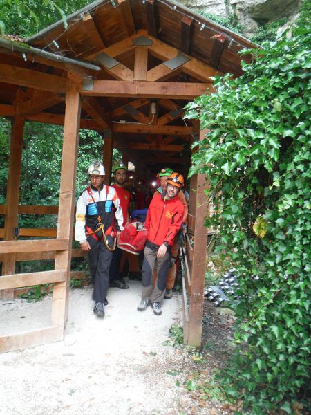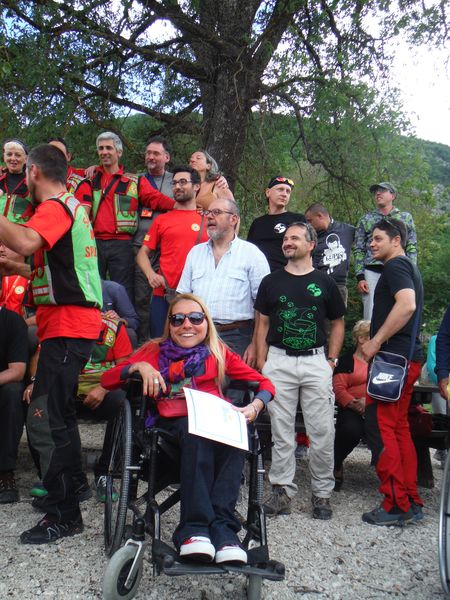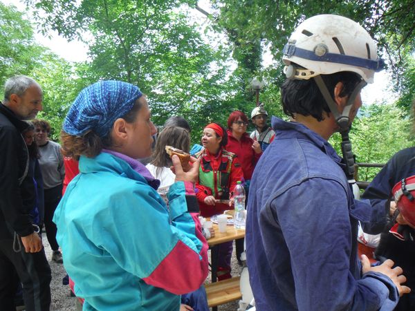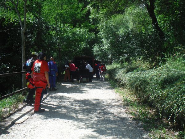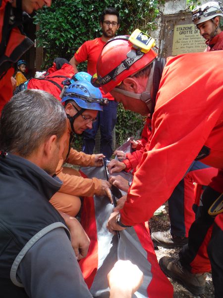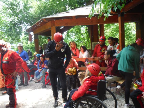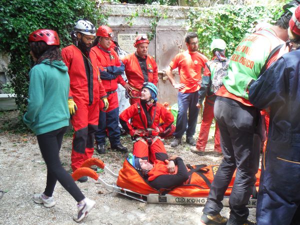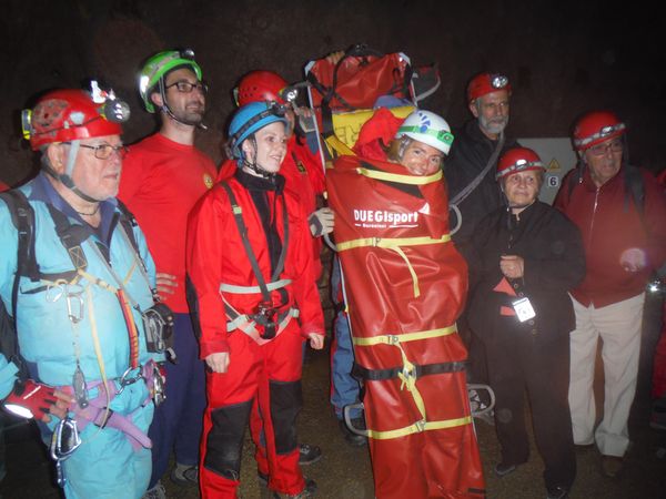 Mentre mi balocco altri lavorano. Sono iniziati i percorsi in grotta. Chi ha difficolta’ a camminare viene portato con una delle barelle, sia da montagna che speleo, a disposizione. Non sono forse la soluzione piu’ comoda in assoluto ma svolgono comunque il loro compito in maniera egregia.