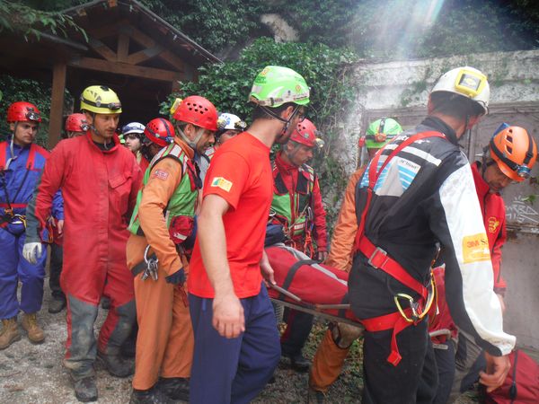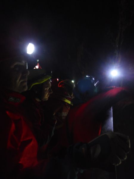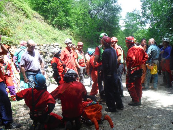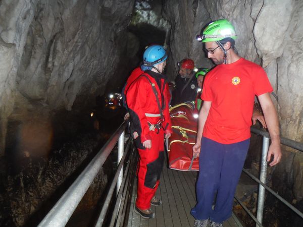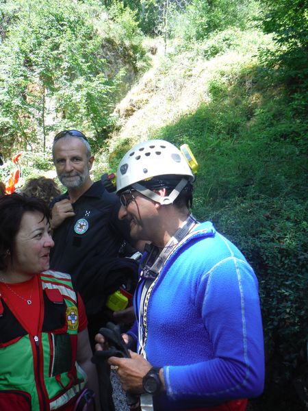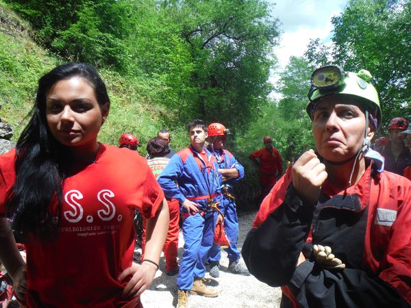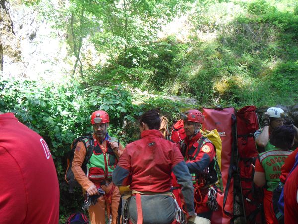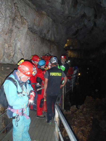 Dopo il graditissimo spuntino decido per un ulteriore giro in grotta. Nel frattempo Sabrina e Betta con Luna al seguito sono entrate per visitarla. Mi avvio con il preciso intento di raggiungerle e stare qualche minuto con loro. In fondo non mi capita spesso l’occasione di essere in grotta insieme a Betta. Stavolta pero’ devo rinunciare, strada facendo incontro Paolo, vedendomi libero mi avverte che alla squadra che segue la sua farebbe comodo un rinforzo. Non mi faccio pregare e mi avvio per raggiungerli. Faccio anche a tempo ad intravedere Betta e a salutarla mentre Luna approfitta per saltarmi addosso e farmi le feste come se non ci vedessimo da un mese. La squadra che ho raggiunto e’ quella dove c’e’ anche Max. Sono gia’ sulla strada del ritorno, sicuramente ce l’avrebbero fatta comunque senza problemi, pero’ un aiuto e’ peccato rifiutarlo quindi vengo rapidamente reclutato e messo al lavoro. Nella parte dove ci sono numerosi gradini sono state attrezzate delle corde per assicurare la barella durante la discesa, una sicurezza in piu’ nell’improbabile caso di una scivolata collettiva, la prudenza non e’ mai troppa. Quando arriviamo fuori ho giusto il tempo per riprendere fiato, ora e’ il momento della squadra di cui faccio parte. Come gia’ detto accompagneremo Simona. Ultime verifiche e siamo pronti a partire.