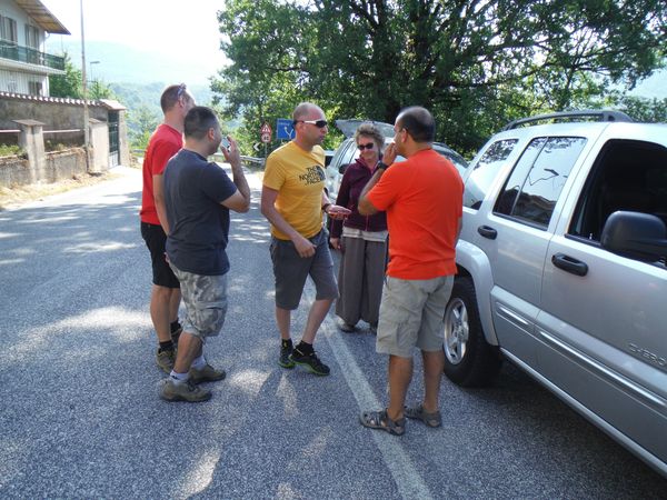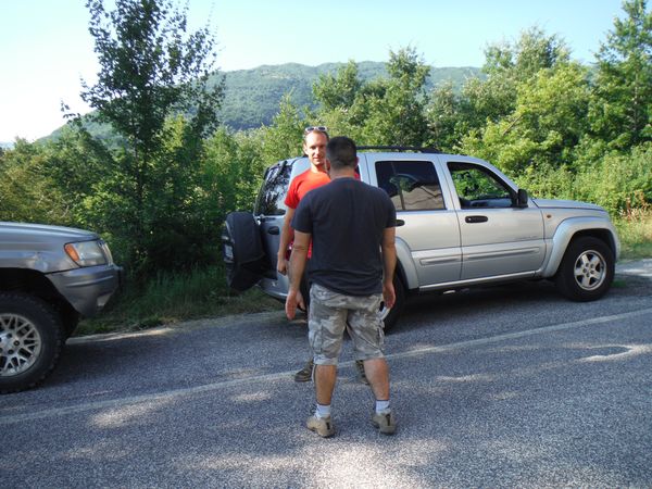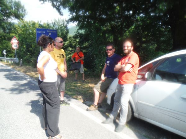 Dopo la pausa colazionatoria proseguiamo senza ulteriori soste. Usciamo a Valle del Salto ed in breve tempo siamo in quel di Civitella. Strada facendo mi chiama Simone. Lui e Filippo arrivano da Orvieto e non sanno dove sia la grotta. Ora sono nei pressi di Civitella. Dico loro di fermarsi a Civitella sulla strada principale cosi’ ci incontreremo sicuramente. Ecco l’incontro tra Jose’ e Stefano.