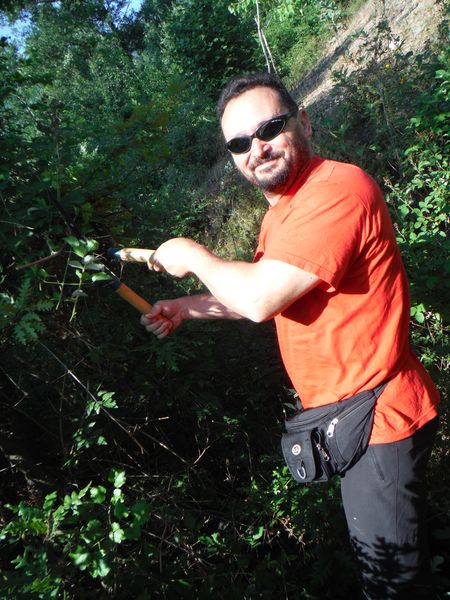 Per scrupolo, e anche per verificare se mi ricordo la strada, seguiamo il sentiero fino alla grotta, facendo pulizia dove serve. Il misero anfratto che indico coi forbicioni e’ dove andremo ad infilarci a breve.