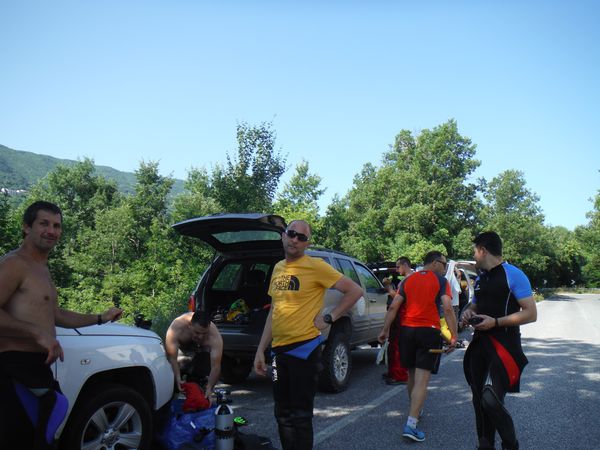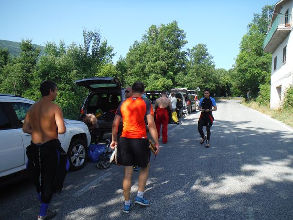 Rimettersi la giacca della muta col braccio cosparso di sabbia non e’ il meglio della vita pero’ serve farlo e lo faccio. Adriano mi raggiunge in pochi secondi. Brighiamo alcuni minuti per rimettere addosso le attrezzature e poi torniamo indietro. Quando sbuchiamo sul terrazzino ritroviamo i nostri in attesa. Annunciamo loro le nostre scoperte e poi scendiamo a raggiungerli. Scendo per ultimo liberando la corda del traversino e sistemando l’armo della corda che rimarra’ per la prossima volta che verremo. Una volta alla base della risalita raccontiamo del sifone con maggior dettaglio mentre sistemiamo l’attrezzatura negli zaini per affrontare il ritorno. La fotocamera inizia a dare segni di cedimento quindi la ripongo. Voglio tenere un po’ di carica per il dopo grotta. Il ritorno e’ tranquillo, una bella passeggiata intervallata da brevi nuotate, ora che ho ripreso temperatura sono anche piacevolmente rinfrescanti. Uscendo recuperiamo la corda che avevamo messo come guida. La breve apnea finale chiude la nostra bella uscita. Fuori ritroviamo quasi tutti, anche Claudio e Maria, un poco accaldati. Mancano solo Simone e Filippo che hanno preferito rientrare. Alle macchine dopo essermi cambiato recupero la fotocamera e ricomincio ad imperversare. L’orientamento generale sarebbe quello di andare a cena assieme. Purtroppo sono nemmeno le 4 del pomeriggio, difficile che qualche ristoratore della zona sia disposto ad accoglierci. Silvia, con santa pazienza si arma di telefono e prova in tutte le maniere ma senza risultato. Si merita comunque un grazie di cuore per l’impegno profuso.