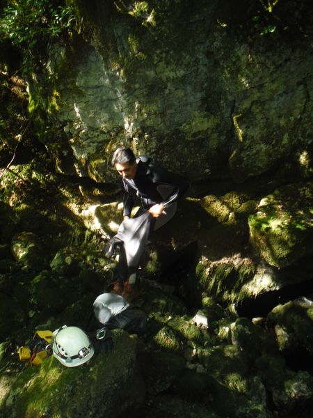 Adriano torna vittorioso, beviamo il the, prepariamo il materiale per la risalita e andiamo. Max opera in parete, io gli faccio sicura. Cedo la fotocamera, a Fabio credo, per documentare. Ecco quel che ne e’ uscito. Qui ci sono io mentre mi preparo a fare sicura.