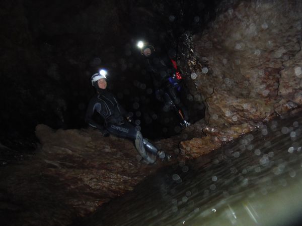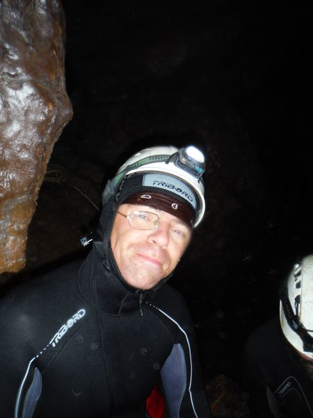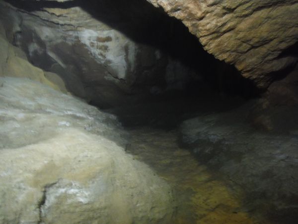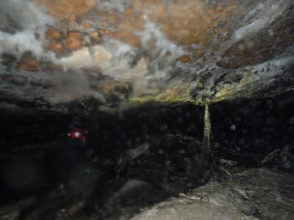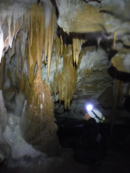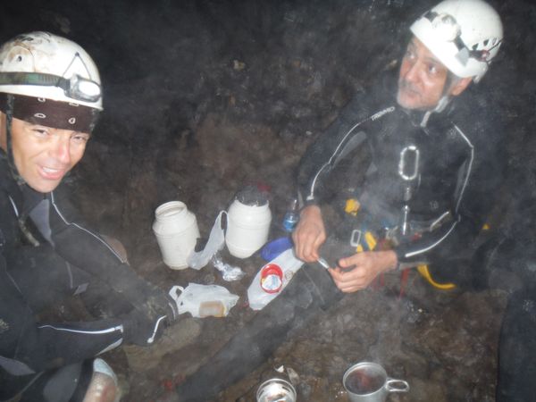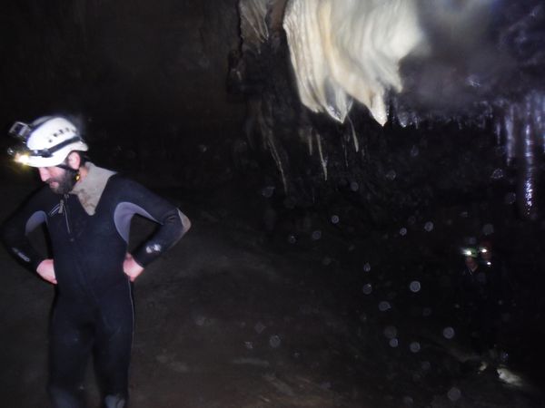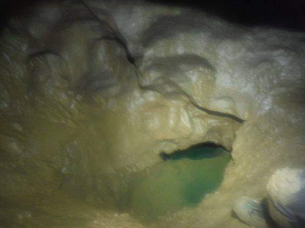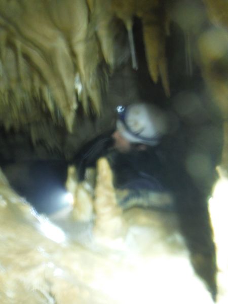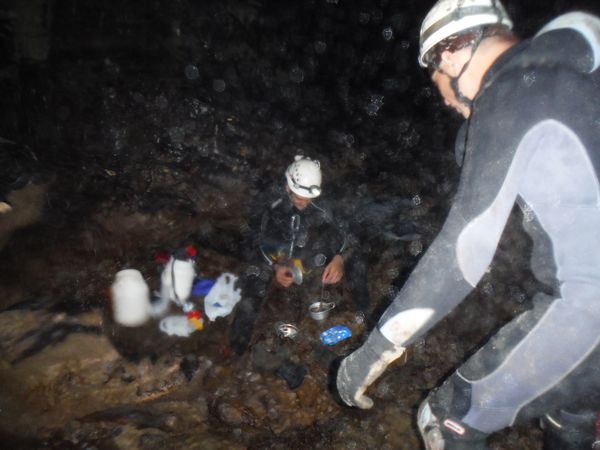 Max e’ arrivato, ora e’ in corrispondenza della vecchia corda. Si addentra per il meandrino che dovrebbe portare al sifone. Quando torna dice di non aver trovato il sifone e di essersi fermato ad una strettoia.
