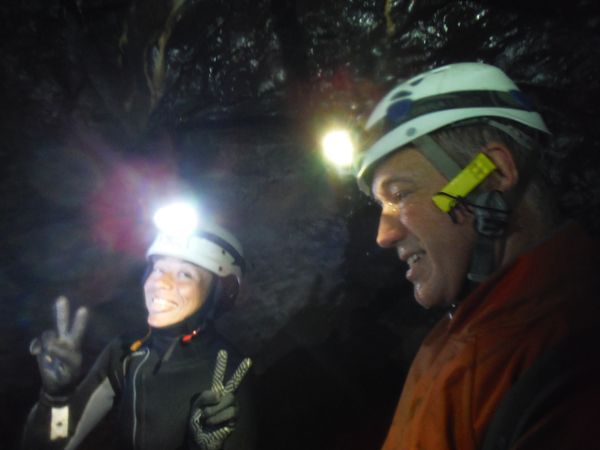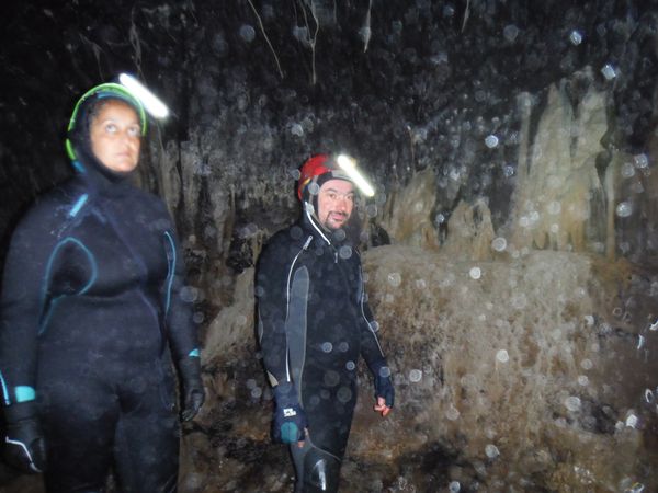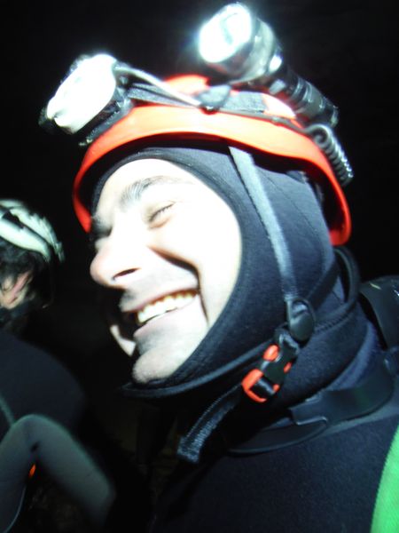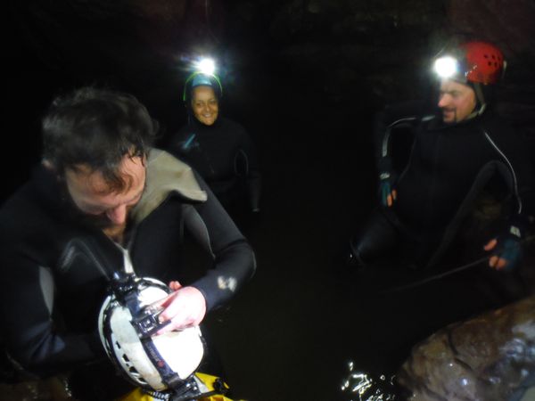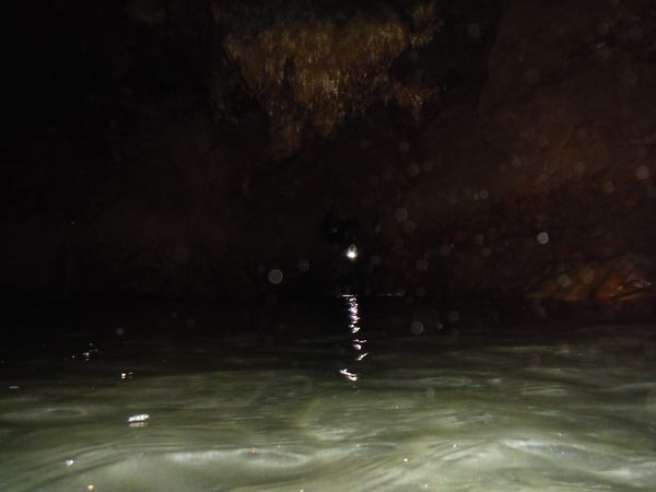 Arrivano un po’ tutti, ci attendono altri brevi tratti in apnea che non sono individuabili se non si conosce la grotta. Con Max mettiamo una corda come guida fino alla sala dove finalmente si puo’ uscire dall’acqua. Nel frattempo faccio avanti ed indietro un paio di volte per indicare la via agli altri che si stanno accumulando subito dopo l’ingresso. Alla fine pero’ la corda e’ sistemata e passiamo tutti senza difficolta’. Una foto a Daniela e Max finalmente fuori dall’acqua.