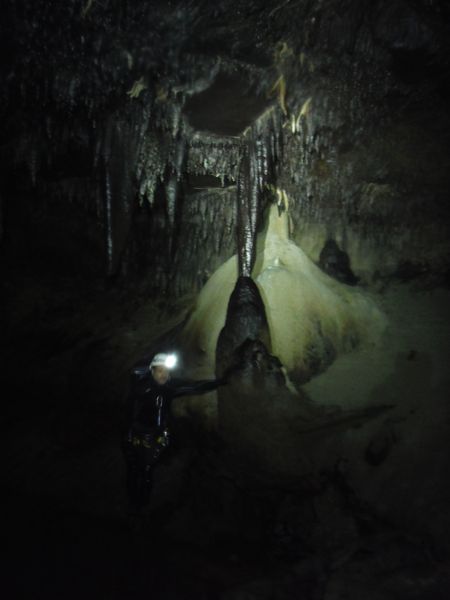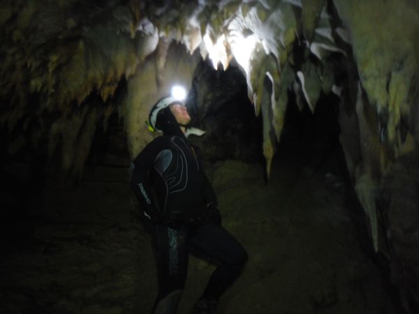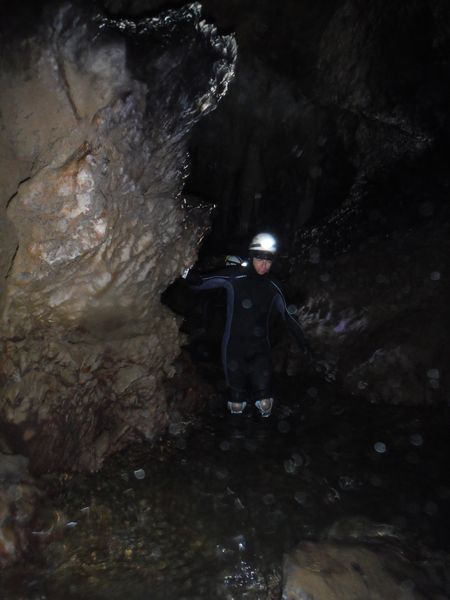 Ora che siamo tutti all’asciutto ci contiamo. Alla fine Claudio e Maria hanno deciso di rimanere all’esterno a godersi il caldo. Simone e’ con noi ma deve lasciarci, ha mangiato poco prima di entrare ed ora non si sente bene. Filippo lo accompagna fuori. Il gruppo superstite prosegue. Io dopo quasi 45 minuti a mollo ho preso freddo e tremo abbastanza ma giudico di poter gestire la cosa, conto di riscaldarmi strada facendo. Proseguiamo. Ecco Stefano che posa accanto ad un gruppo di concrezioni dal colore nero. Fabio che ne capisce, ci dice che trattasi con ottima probabilita’ di ossido di manganese.