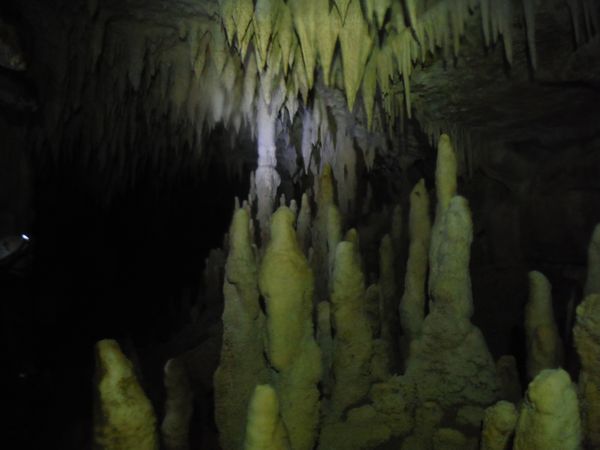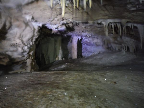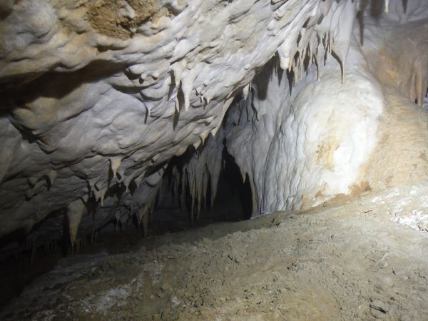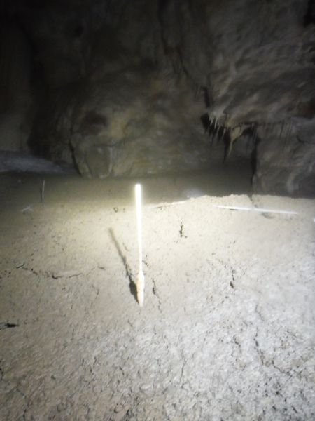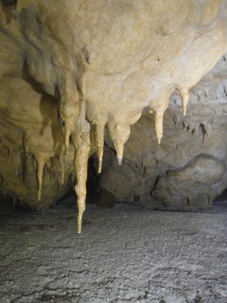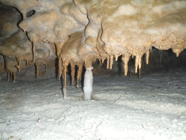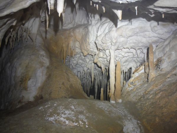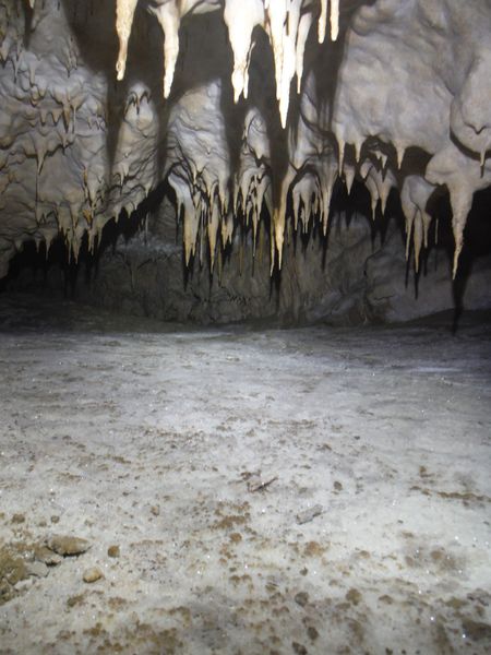 Il pavimento e’ una sottile crosta di concrezione di un bianco candido. Alcune stalattiti sembrano esservi rimaste conficcate dentro.