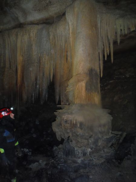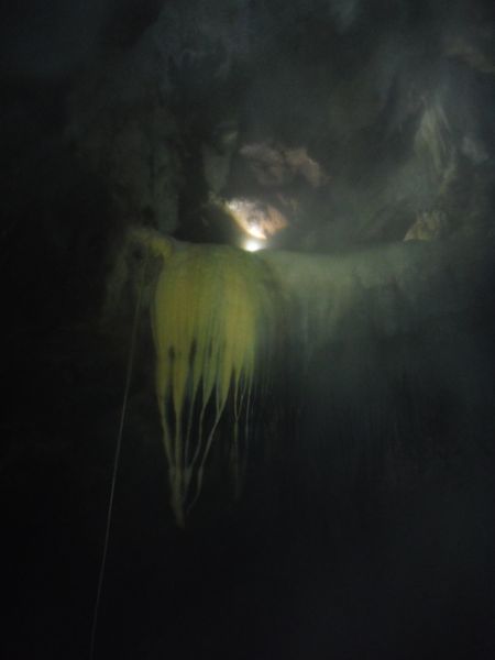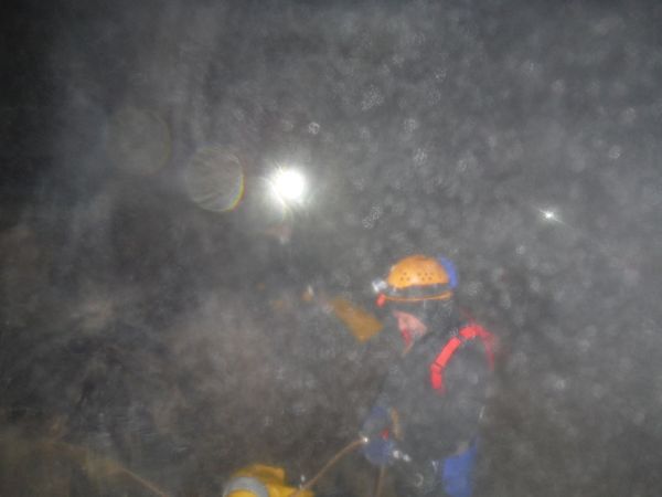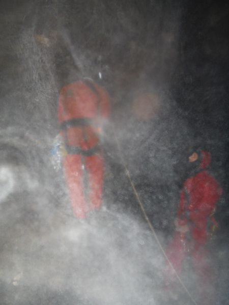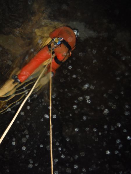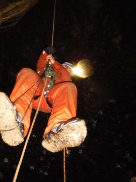 Arrivati a 3/4 della risalita deve rinunciare, lo strato di calcite sulla corda e’ cosi’ spesso e tenace che la corda si incastra nella gola degli attrezzi e non permette di salire oltre. Riscende piano piano sui bloccanti.