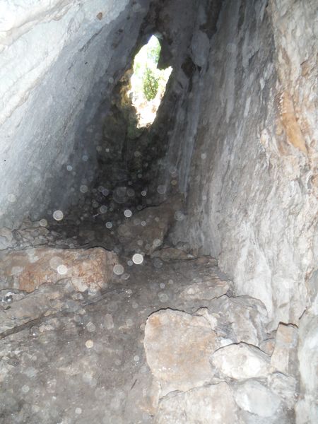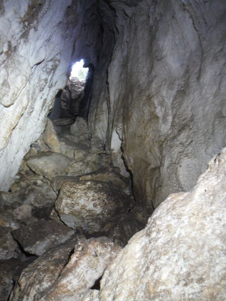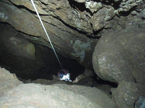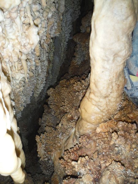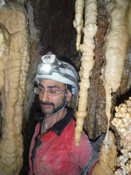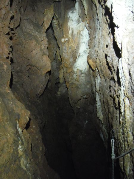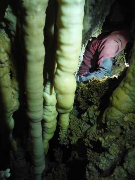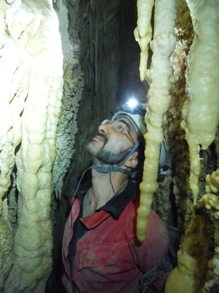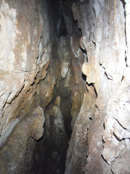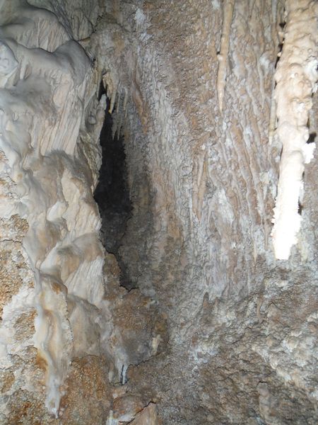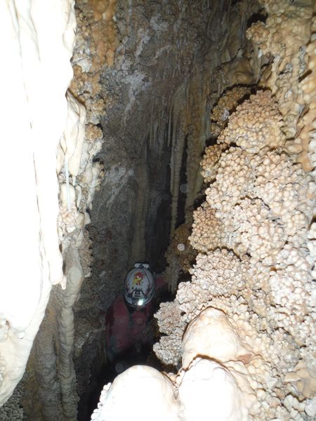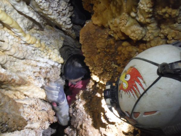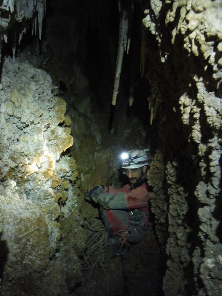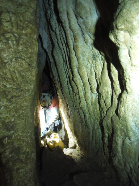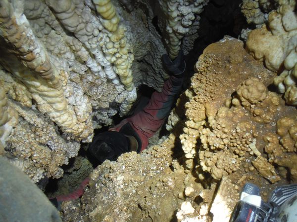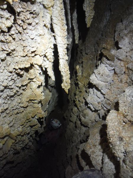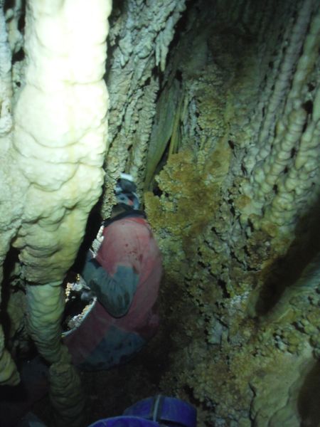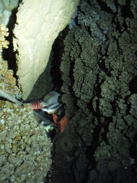 Arrivati alla base del pozzo devo orizzontarmi un po’ per ritrovare il punto da vedere. Faccio per arrampicarmi ma e disagevole e ricordo che la volta scorsa ci ero arrivato senza particolari manovre. E’ davanti a me, parzialmente nascosto da una roccia. Eccomi! Devo allargare un poco il passaggio ma si tratta di un lavoro di pochi minuti, piu’ che altro devo spostare qualche sasso. Quando il passaggio e’ comodo mi faccio da parte per far passare Matteo, gli cedo volentieri il piacere dell’esplorazione. D’altronde quando si ha a disposizione uno strettoista e’ meglio sfruttarlo! In effetti spero non servano le sue doti e la grotta ci dia ancora qualche sorpresa ma il suo rapporto mi lascia desolato. Dopo nemmeno 2 metri restringe in un caos di concrezioni bellissime ma impenetrabili. Mi faccio forza e vado a dare un’occhiata anche io. Per me il passaggio non e’ agevolissimo ma comunque passo. Devo mettere mani e ginocchia un una maleodorante pozza di guano, probabilmente il posto e’ stato sede di una piccola colonia di pipistrelli. Davanti a me vedo Matteo, nella parte strettissima.