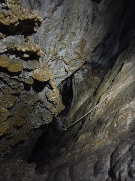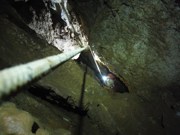 Dopo i 2 pozzi passiamo la strettoia, il tratto di meandro, la spaccatura e siamo al pozzo successivo. Matteo oramai ha preso la mano e va spedito. Eccolo che sistema il deviatore.