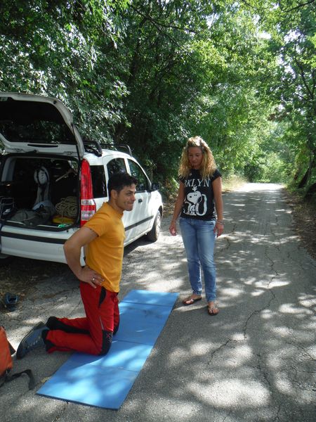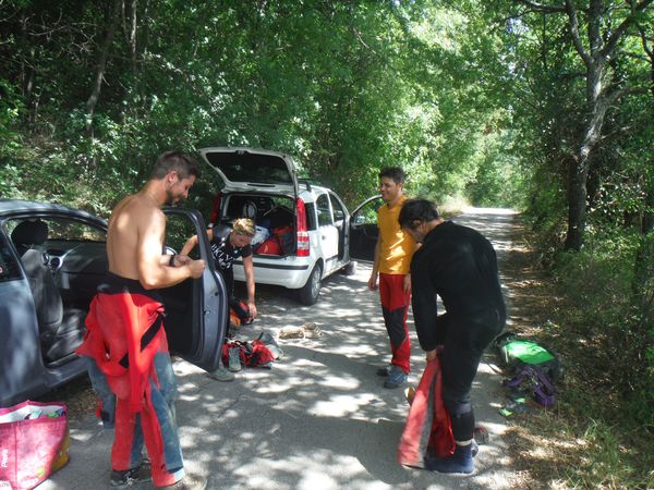 Dopo un bel tratto di strada, sempre asfaltata ed in buone condizioni arriviamo alla grotta. Non e’ evidentissimo dove sia, il posto e’ indicato da un paletto quadrato piantato a lato strada. Appena arriviamo succede il patatrac, iniziamo a cambiarci con calma fino a quando Simone ci avverte: “O, rega’, non riesco piu’ a muovermi!”. Si e’ beccato il colpo della strega. Lo mettiamo subito in ginocchio perche’ possa chiedere perdono dei propri peccati e ricevere quindi sollievo.