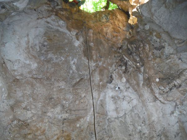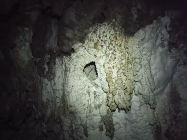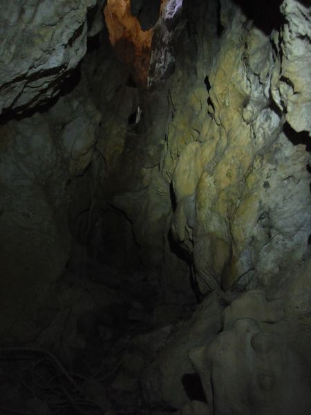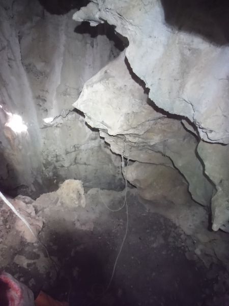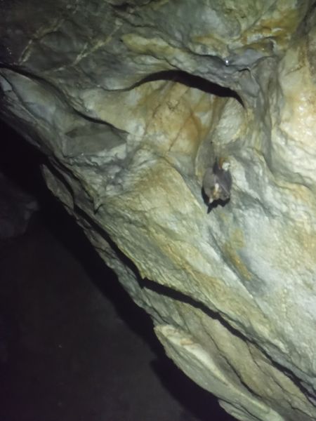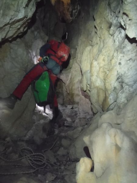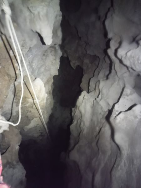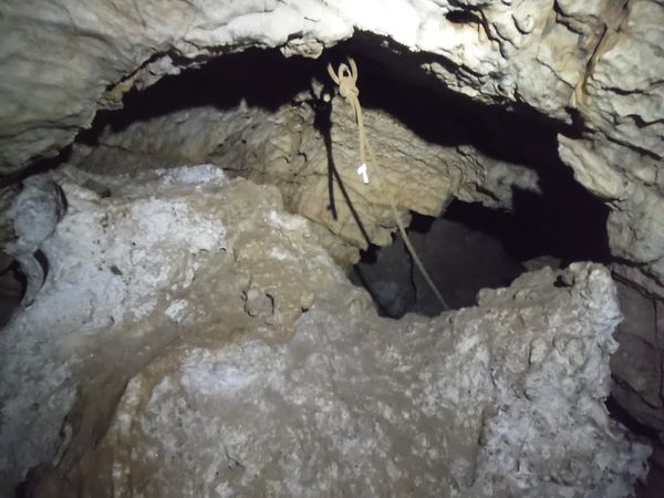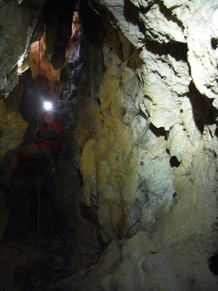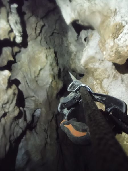 Di lato, scavalcando un sassone, si vede partire una corda. Deve essere il pozzo successivo. Da sopra ancora nulla. Vado a scendere anche lui. Arrivo nella sala piu’ grande vista finora. Sono accolto da un irato stridio di un mucchio di pipistrelli. Li sto disturbando. Abbasso la luce al minimo e me ne resto un minuto immobile. Quando si calmano me ne torno indietro e attendo i miei amici che ora sento rumoreggiare poco sopra.