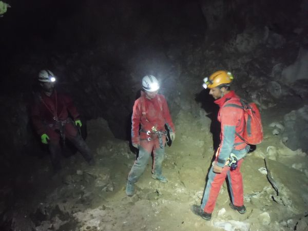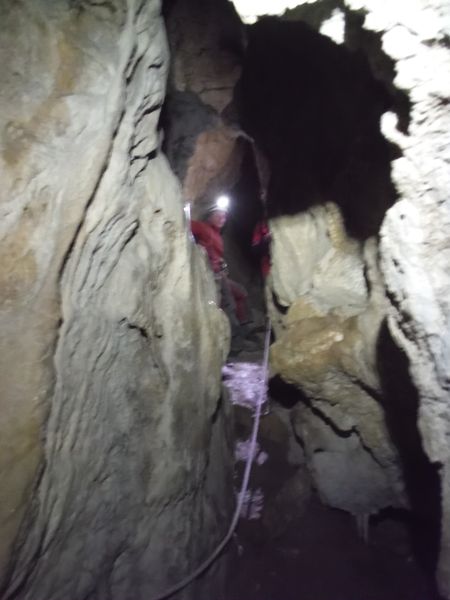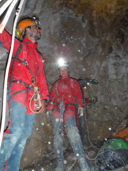 Giulio, Ginevra e Giuseppe arrivano portando le altre corde. Hanno rifatto l’armo da poco, ci sono addirittura gli attacchi completi di maglie rapide! Mettiamo la corda per il pozzetto successivo, quello che porta al ramo “caldo”.