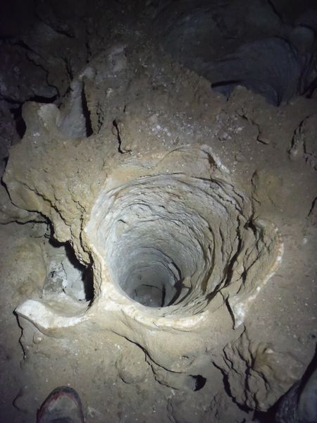 Nella sala dove arrivo mi guardo intorno. C’e’ ancora un pozzo molto evidente ma anche questo non e’ armato. Ci sono questi profondi buchi di una ventina di centimetri di diametro che mi impegnano in qualche foto.