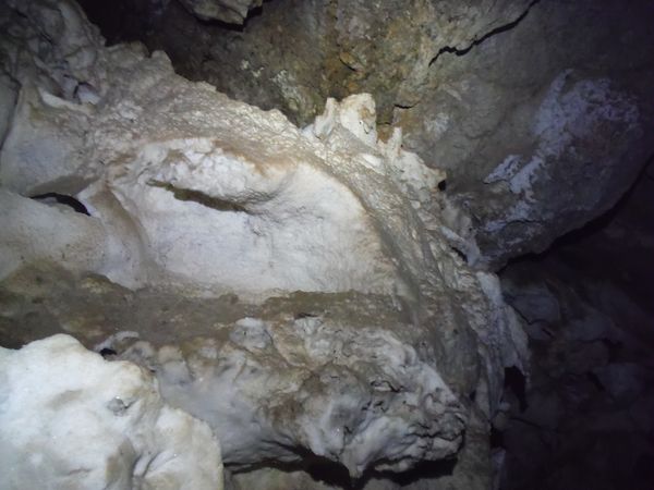 In mezzo alle rocce di buon calcare ci sono molte escrescenze bianche che sembrano neve sporca e semisciolta, penso oziosamente possano essere gesso ma continuo la discesa lasciando queste valutazioni a chi ne sa piu’ di me.