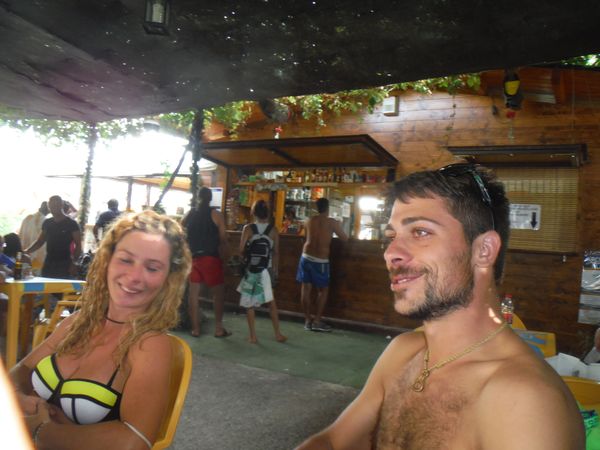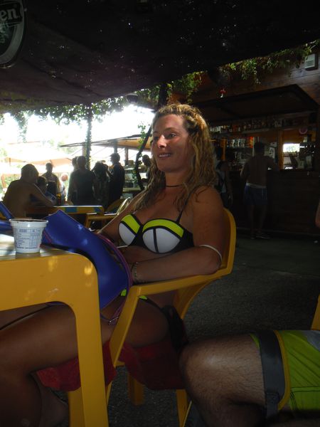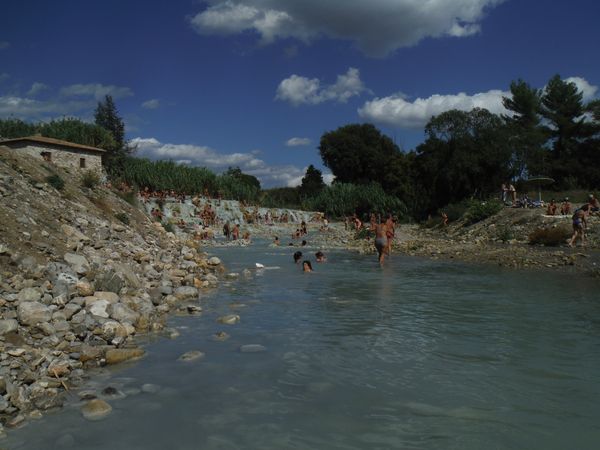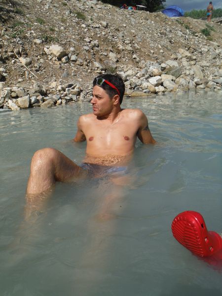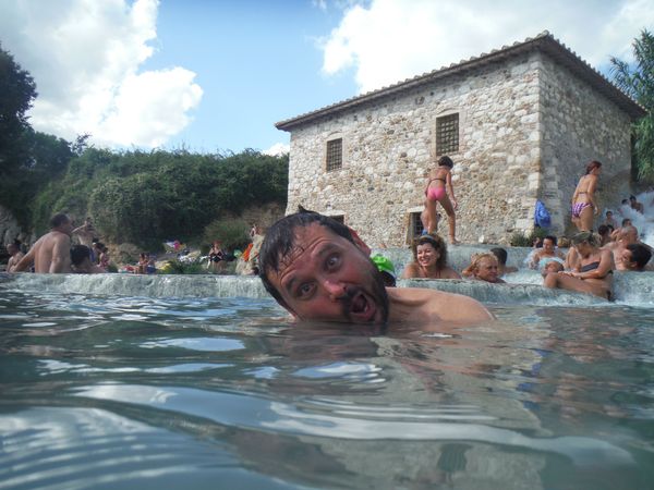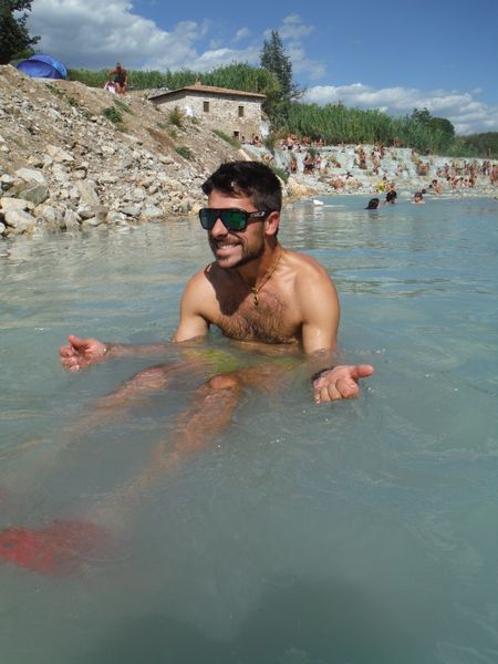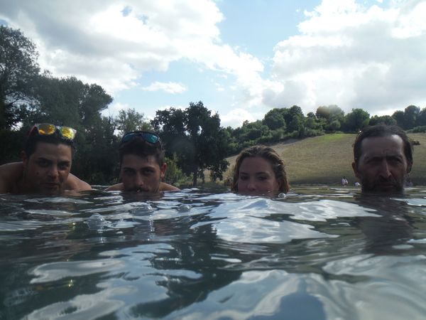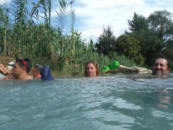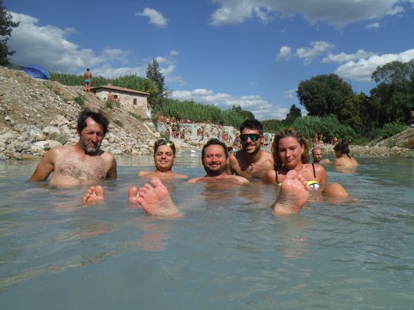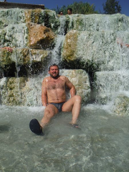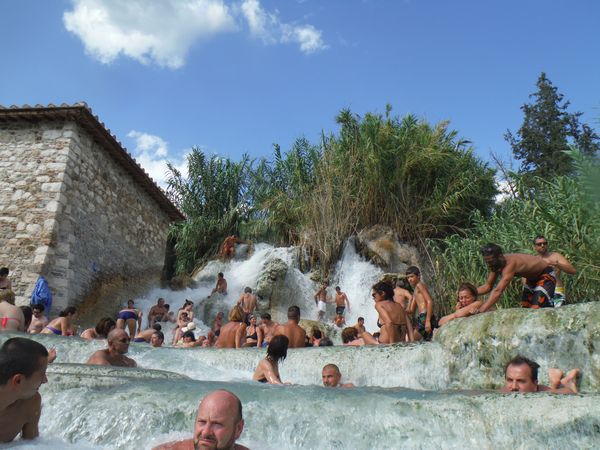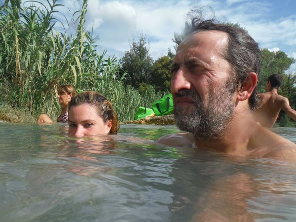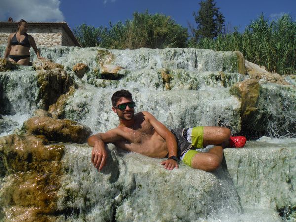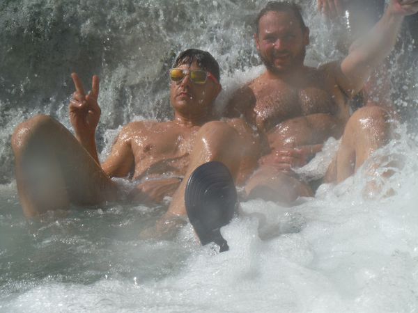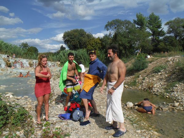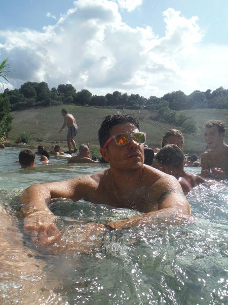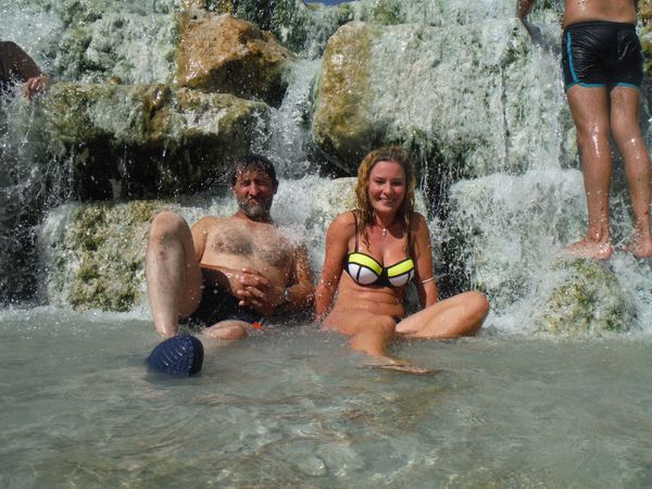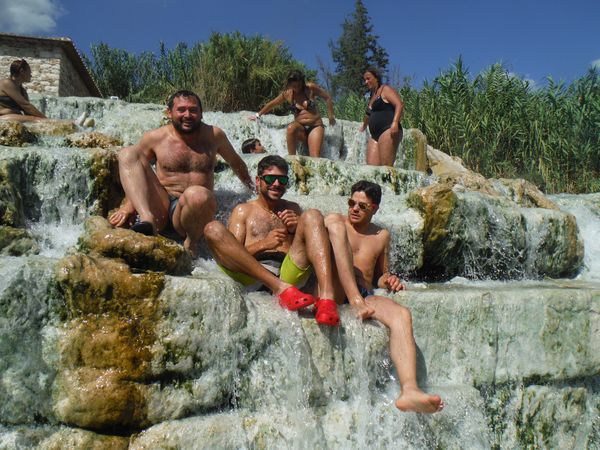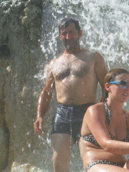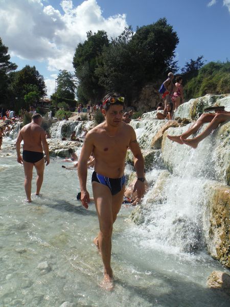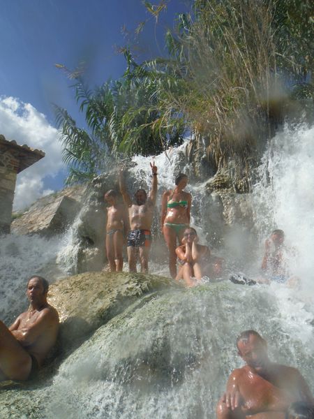 Dopo il traversamento e la sistemazione dei panni, ci avviciniamo gatton gattoni alle vaschette dove c’e’ un cumulo impressionante di gente. Siamo pronti a rivendicare un angoletto anche per noi. Ginevra mi scatta una foto sotto “cascata”.