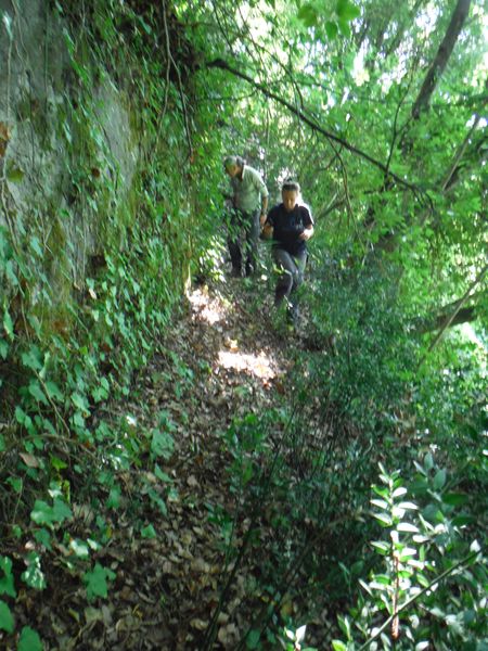 Procediamo lungo uno stretto sentiero, a destra la parete che “nasconde” i cunicoli, a sinistra uno strapiombo che sembra arrivare giu’ fino al lago.