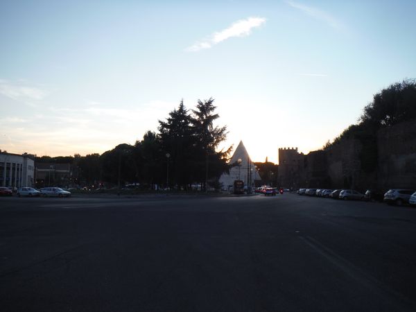 Svelti svelti ci cambiamo poi ci avviamo prendendo la via dei laghi, quindi l’appia, l’appia antica, poi costeggiamo le mura ed infine sbuchiamo alla piramide.