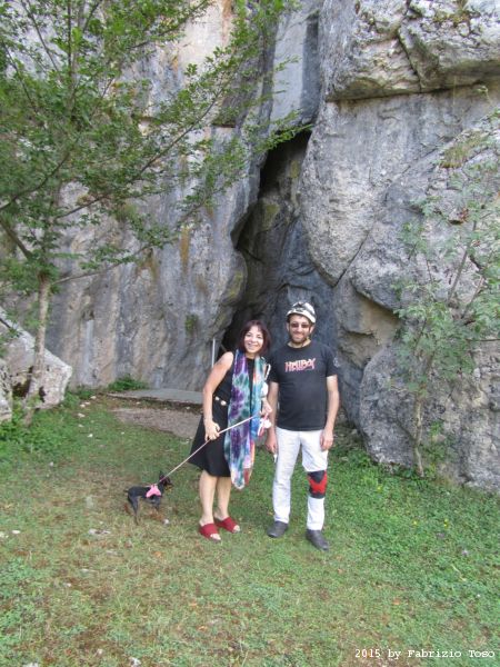 Dopo la visita al paese ci rechiamo al locale ristorante “Il Verrecchiano” dove diamo soddisfazione al nostro appetito. Terminato il pranzo con un buon caffe’ torniamo alla macchina e facciamo il breve tratto di strada per arrivare alla grotta. Alla biglietteria troviamo Gabriele che ci presenta ai gestori della grotta, Corrado ed Alvaro che pero’ scompaiono quasi subito perche’ hanno dei gruppi da accompagnare. Gabriele si offre di farci da guida per una visita alla grotta “Beatrice Cenci”, accettiamo ben volentieri. Ecco Betta e Gabriele davanti all’ingresso.