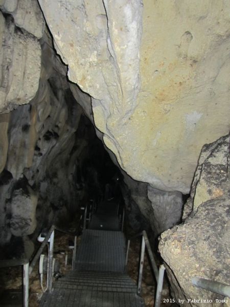 Andiamo avanti nel buio. Infatti la scelta di Corrado ed Alvaro e’ stata quella di non illuminare la grotta con lampade fisse per impedire il proliferare di muffe e/o vegetazione varia. Chi visita la grotta quindi viene munito di casco e lampada a led. Un’ottima scelta direi.