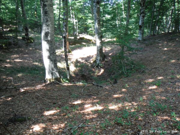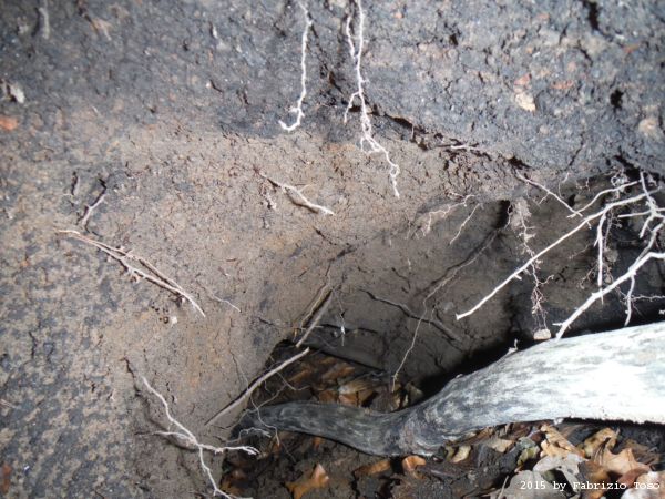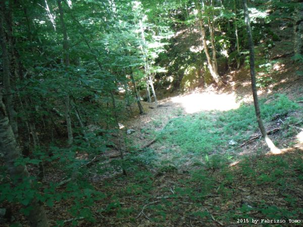 In un punto la terra si e’ sfaldata e il bastoncino sprofonda nel buco senza problemi per tutta la lunghezza, c’e’ pure la sensazione che tiri un filo d’aria ma non ci giurerei. In ogni caso ci vorrebbe una pala per fare qualcosa di piu’. Rinunciamo, prendo il punto gps e ripartiamo.