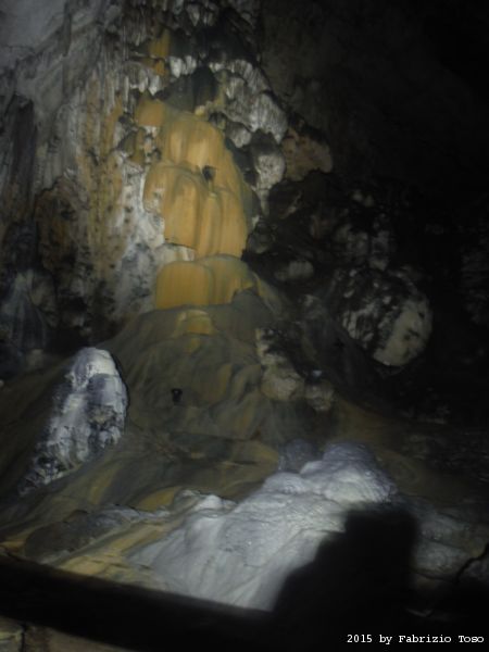 E’ ancora agosto, periodo di vacanze un po’ per tutti. Io le sto passando a Tagliacozzo e la grotta Beatrice Cenci me la ritrovo quasi sotto casa. Come vi ho raccontato alla fine della precedente relazione, ho passato il ferragosto con un febbrone da cavallo. In pratica oggi e’ il primo giorno che mi sento abbastanza in forma da fare qualcosa di piu’ che vegetare. Tanto per tornare in ottica ipogea convinco la mia dolce meta’, Betta, a fare di nuovo una gita dalle parti della grotta, con visita preventiva a Verrecchie e pausa pranzo al “Verrecchiano”, ristorante che incontra il suo gradimento, ed anche il mio! Dopo pranzo andiamo a fare il chilo alla grotta, dove troviamo Alvaro in piena attivita’. Dopo qualche chiacchiera viene richiamato al dovere, c’e’ da accompagnare un gruppo e mi propone di accompagnarlo. Mi aggrego con piacere con l’intenzione di tentare qualche foto. Betta continua a riposare quietamente seduta nei pressi della biglietteria.