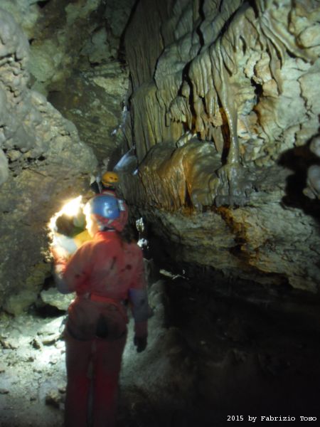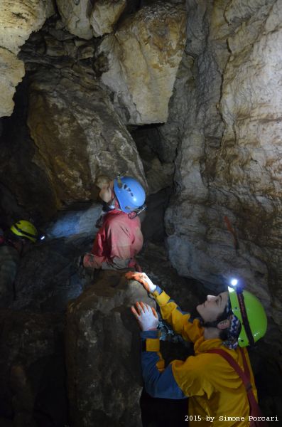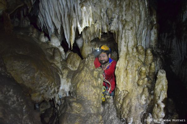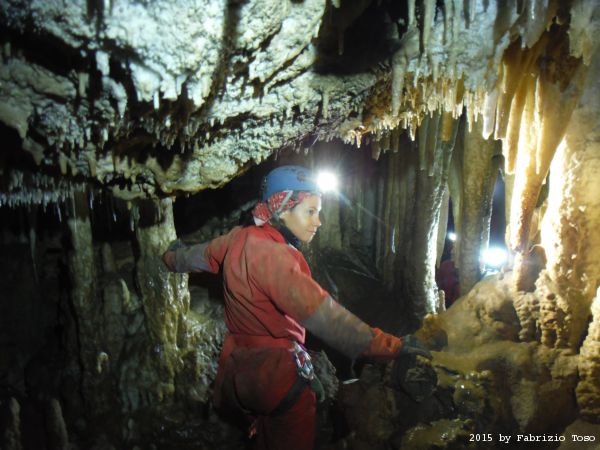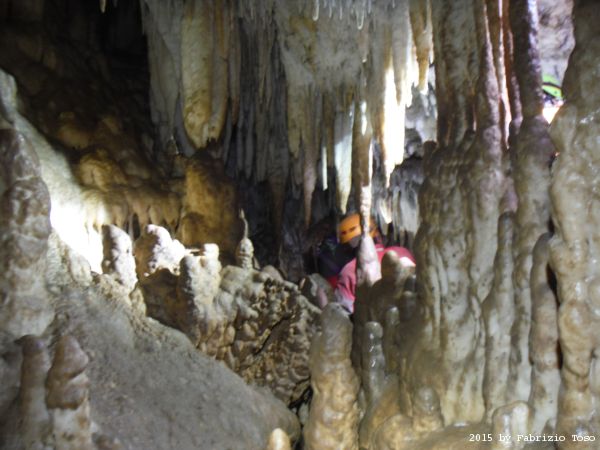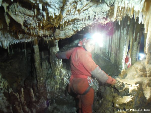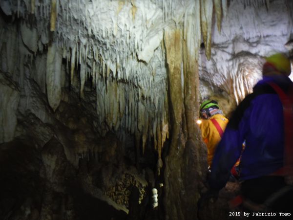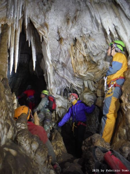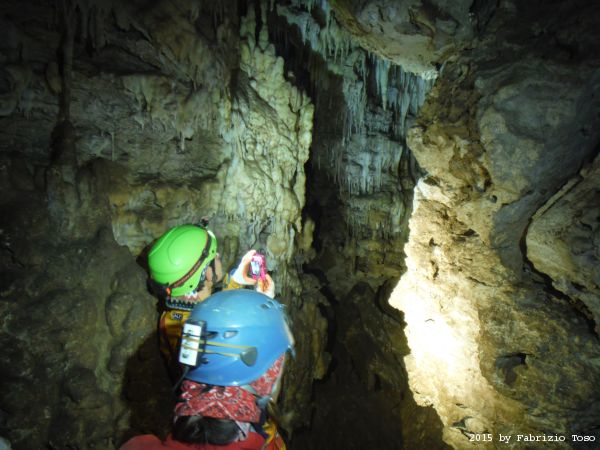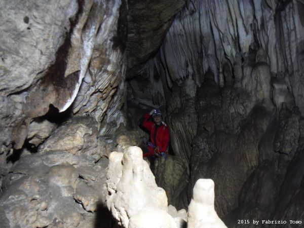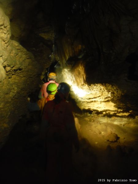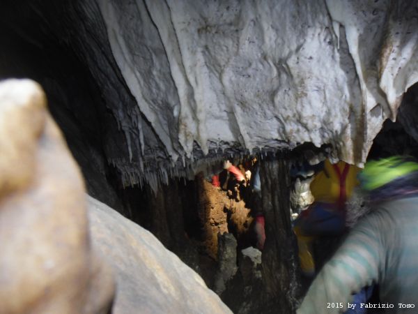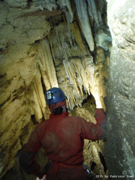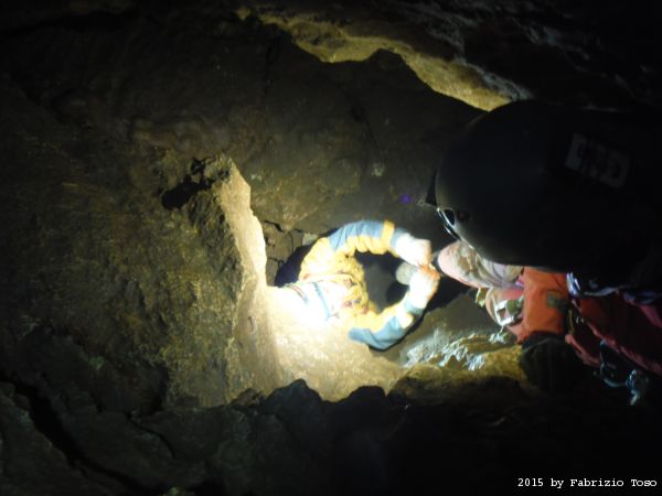 Scende prima Simone che sistema la corda. Passeremo per il traverso armato con il cavo di acciaio che permette di evitare la strettoia, classico passaggio nonche’ spauracchio di tutti i neo speleologi che vi si imbattono.