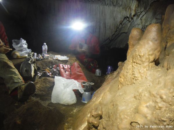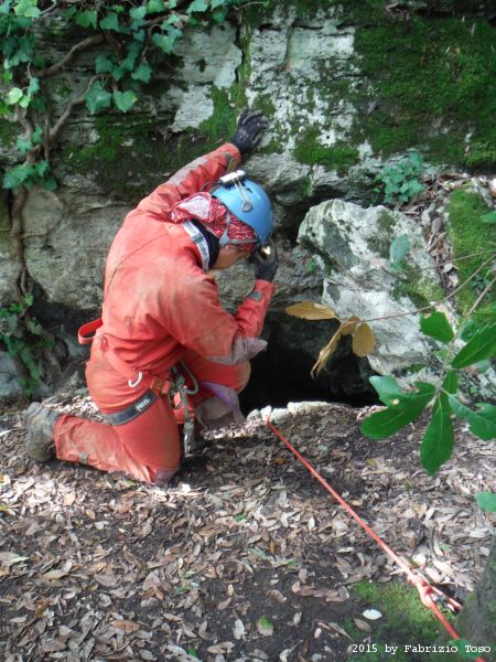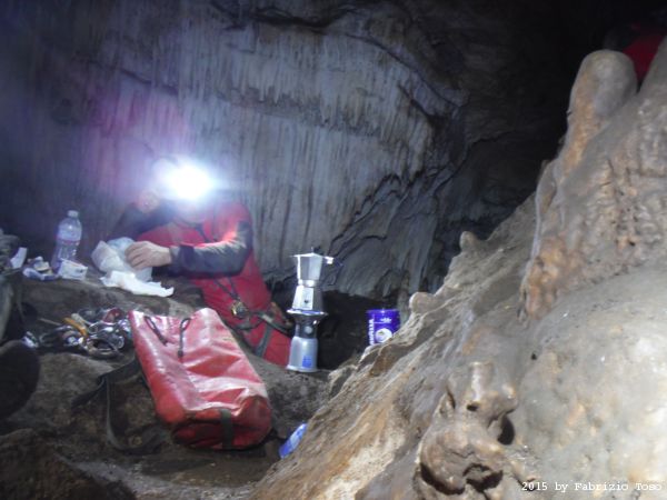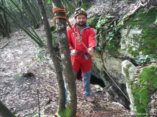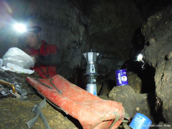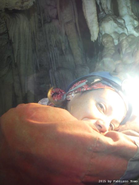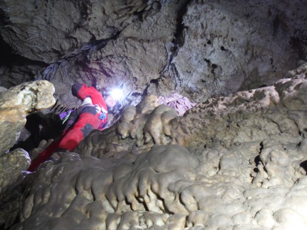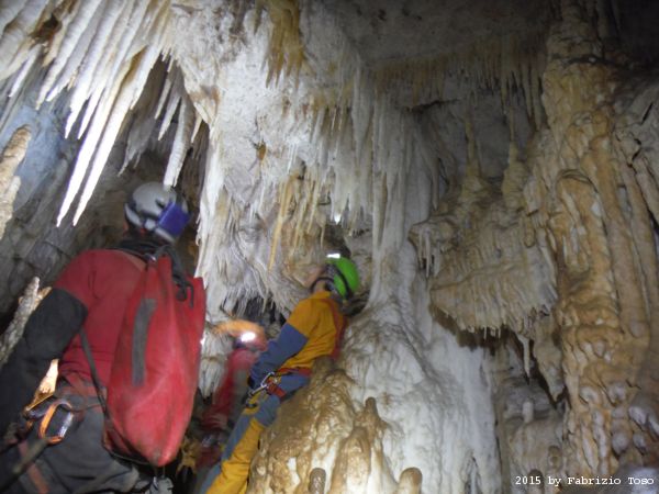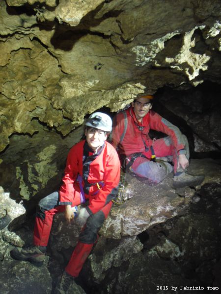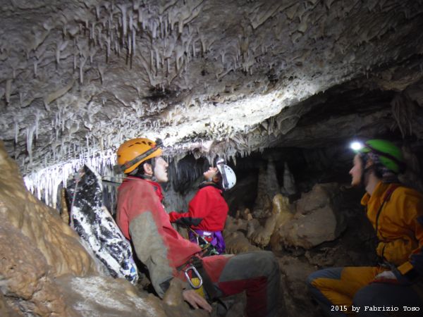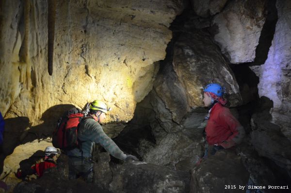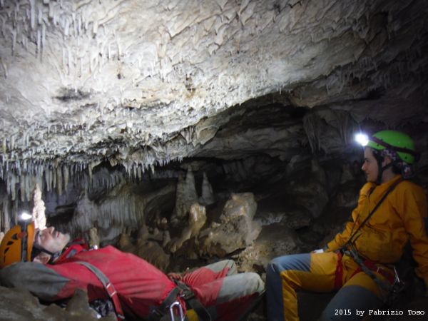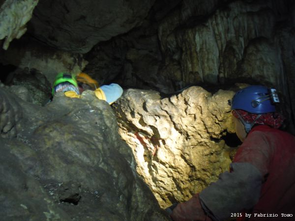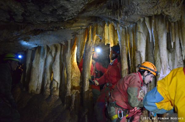 Scende prima Simone che sistema la corda. Passeremo per il traverso armato con il cavo di acciaio che permette di evitare la strettoia, classico passaggio nonche’ spauracchio di tutti i neo speleologi che vi si imbattono.