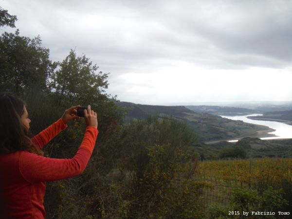 Ci vestiamo, prepariamo le nostre robe e poi partiamo. Lasciamo andare avanti Claudia con la Panda. Lasciamo con lei solo Alessandro col compito di darle consiglio e di fare da zavorra sull’avantreno! Noi altri “pesi inutili” ci stipiamo nel fuoristrada di Simone. Le domande che ci poniamo tutti sono: “Ce la fara’ la Panda a risalire l’insidiosa erta che riporta al borgo? Nel caso ce la facesse, bastera’ la benzina?” Per smaltire l’ansia, mentre Claudia affronta il cimento, ci fermiamo per ammirare il lago ed il panorama circostante.