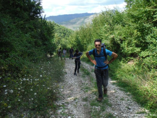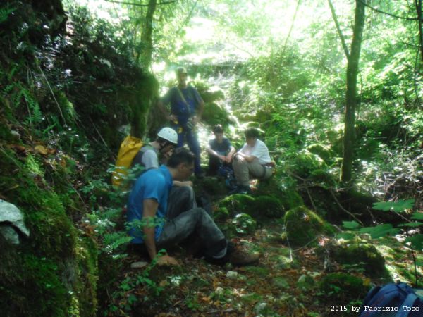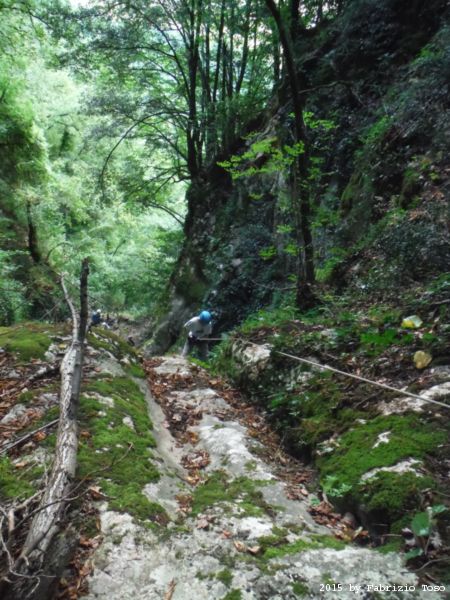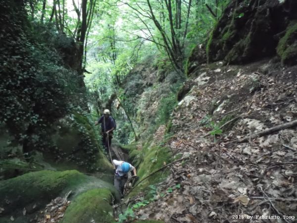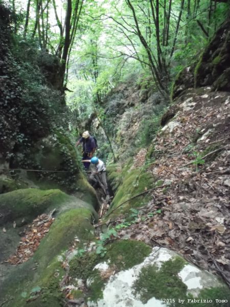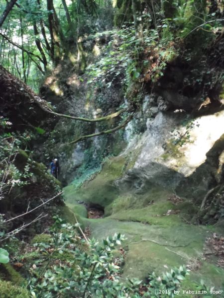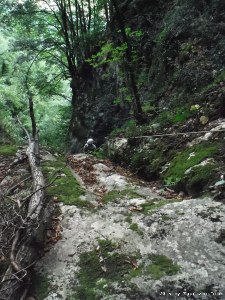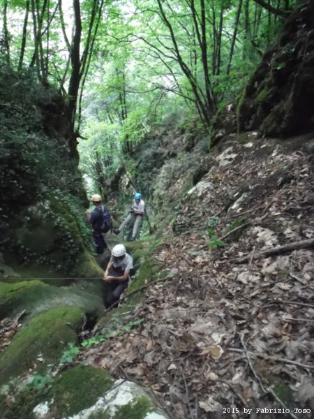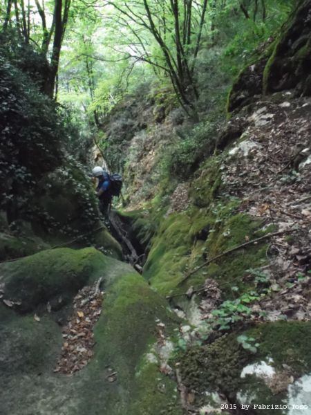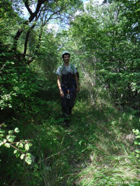 Arrivati in cima dobbiamo fare avanti ed indietro un paio di volte per cercare l’imbocco del sentiero che conduce alla partenza della forra. L’unica certezza e’ che la forra e’ alla nostra sinistra. Dalla cima quindi torniamo indietro cercando a destra. Il primo sentiero che incontriamo e’ evidente ma Stefano ricorda che non e’ quello giusto, si sono persi con lui gia’ la volta scorsa. Piu’ avanti di almeno 10 metri c’e’ un sentiero appena accennato, e’ lui quello giusto. Lo assaliamo con audacia e sprezzo del pericolo subito godendo della frescura data dall’ombra delle piante.
