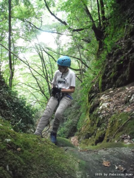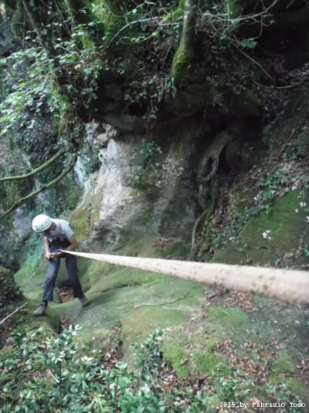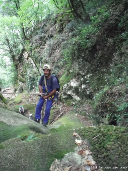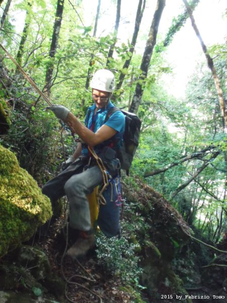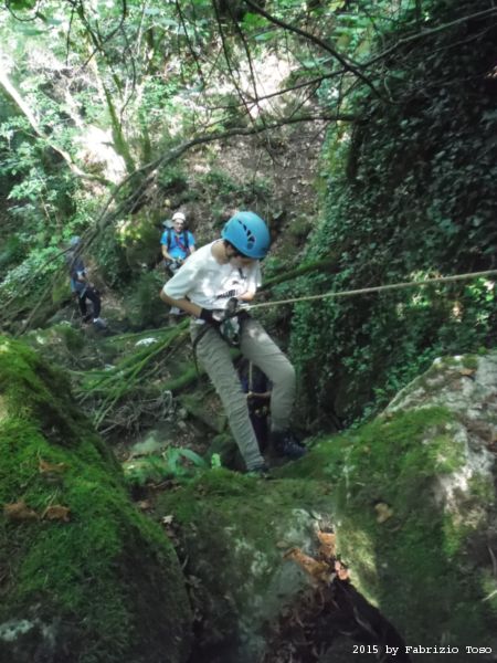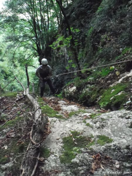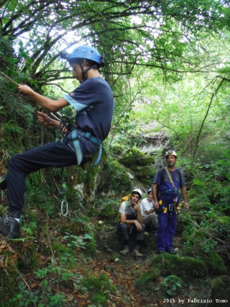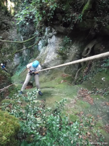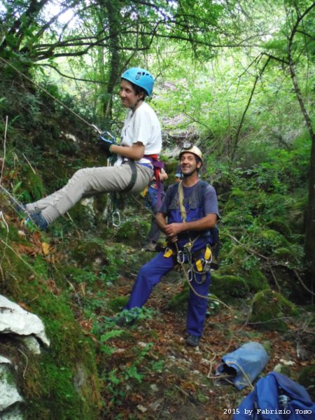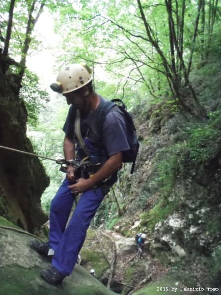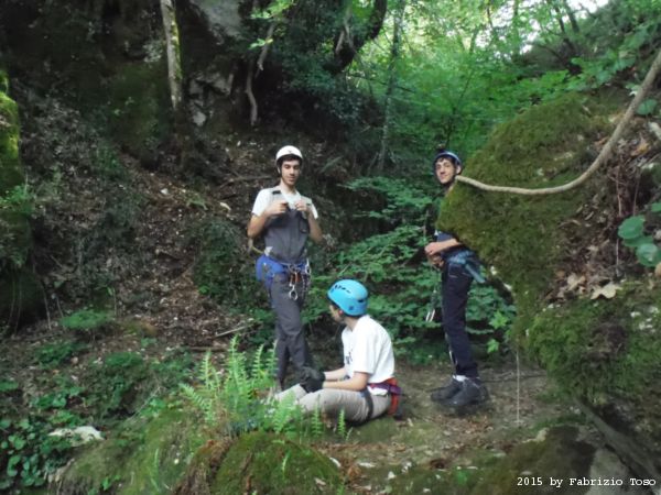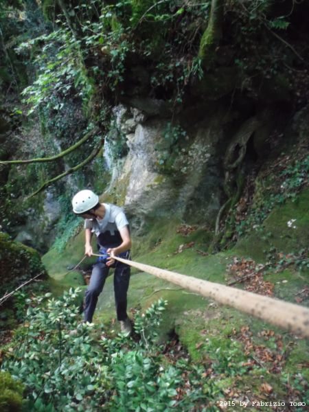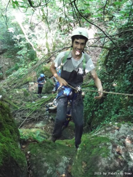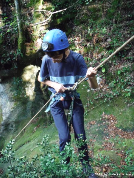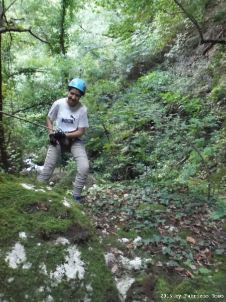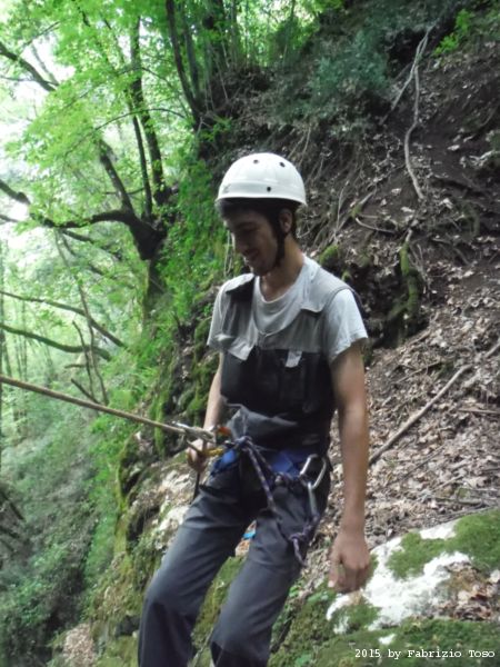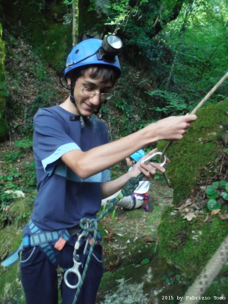 Iniziamo la discesa della forra. Ora si fa sul serio! Il primo a scendere dopo Stefano e’ Tommaso, quindi e’ il momento di Andrea.