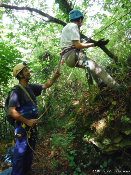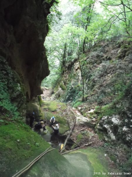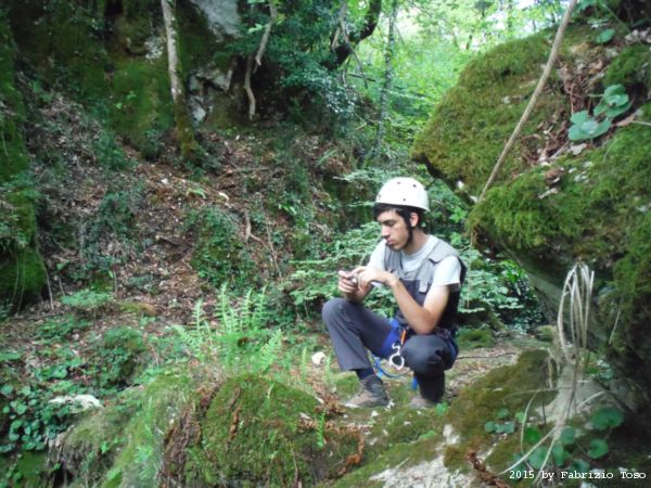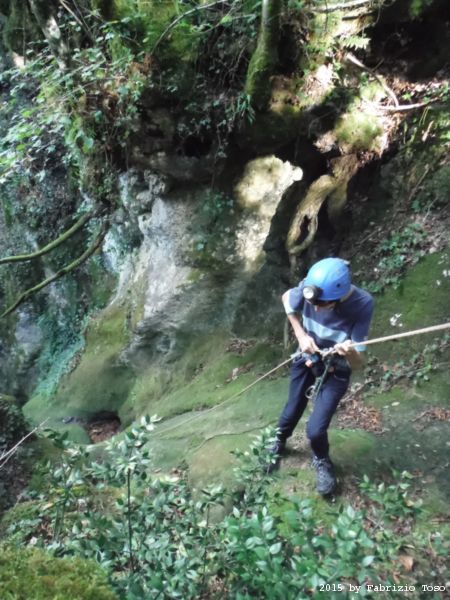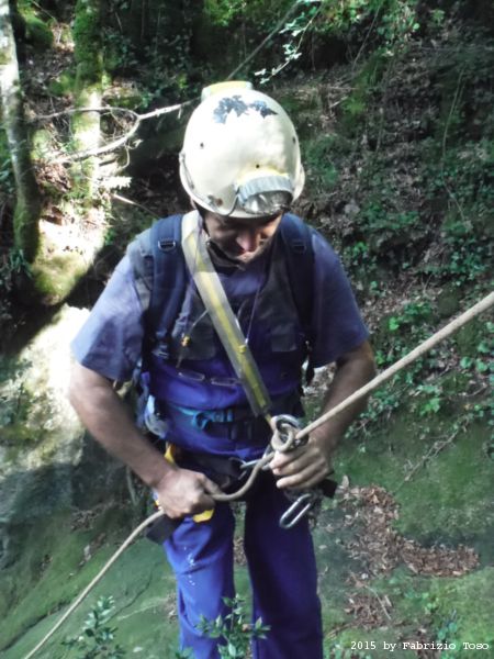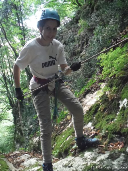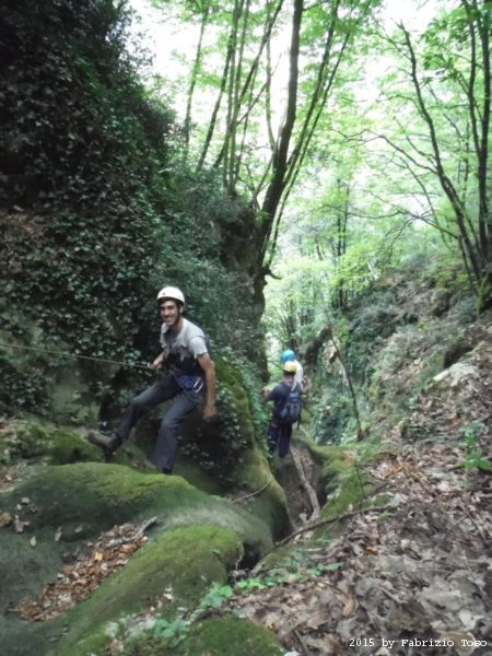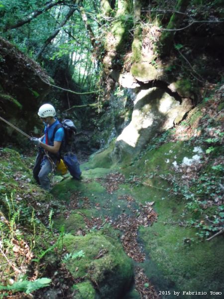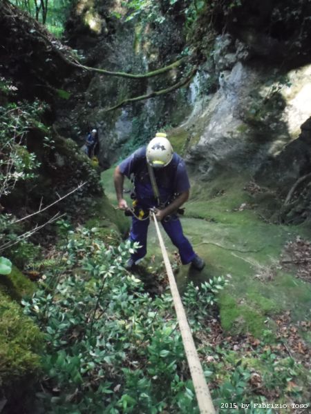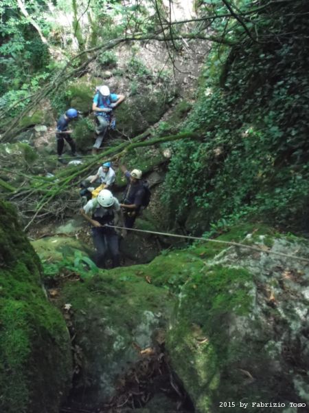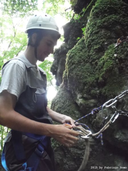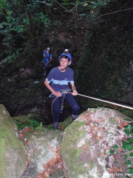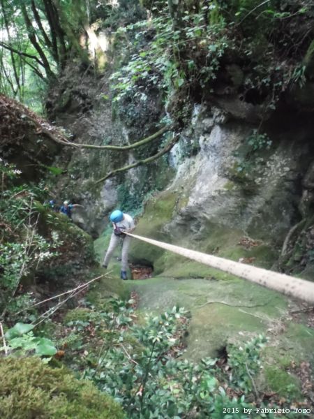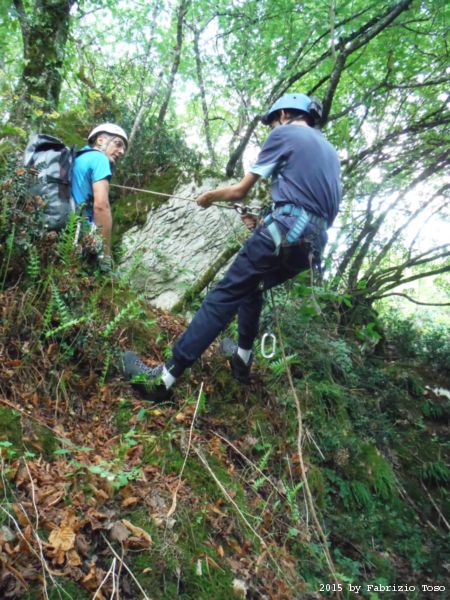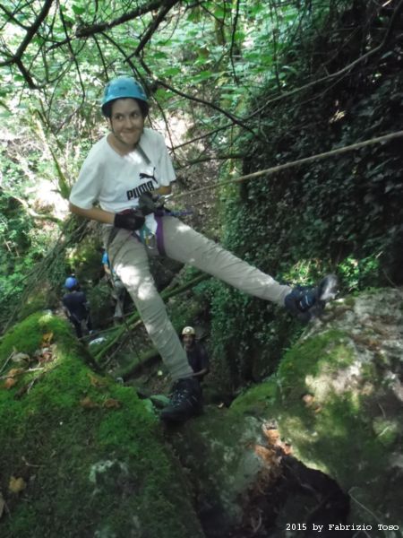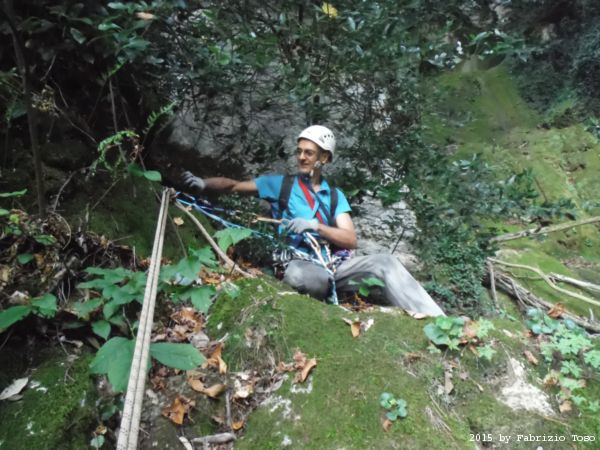 Iniziamo la discesa della forra. Ora si fa sul serio! Il primo a scendere dopo Stefano e’ Tommaso, quindi e’ il momento di Andrea.