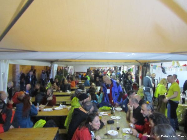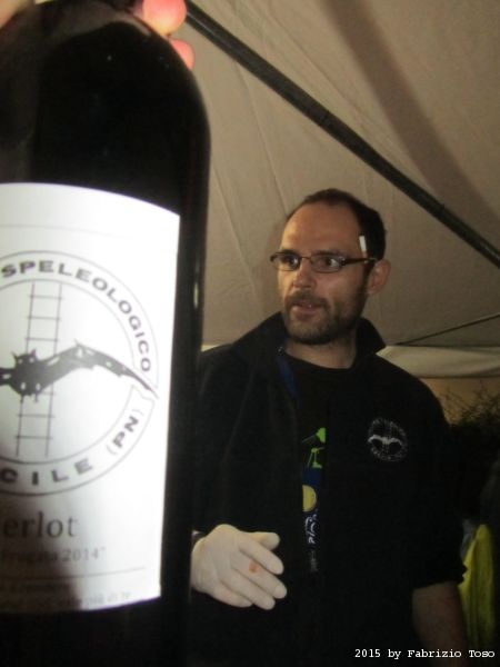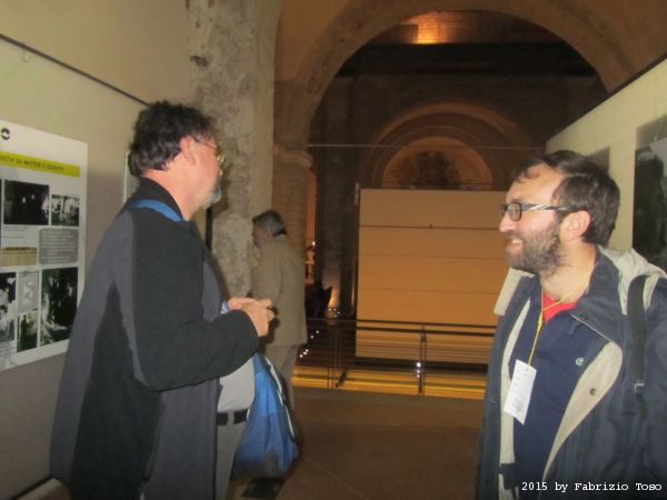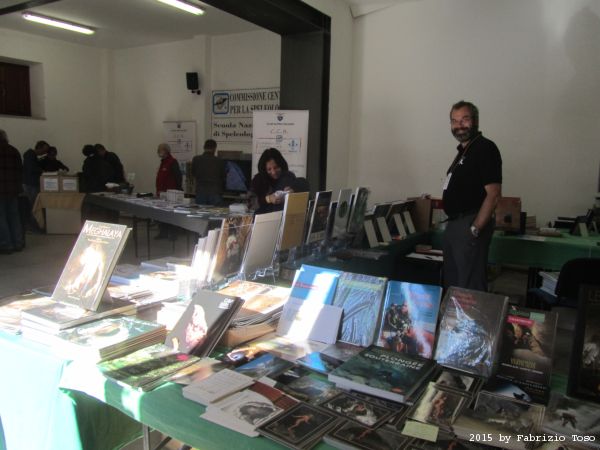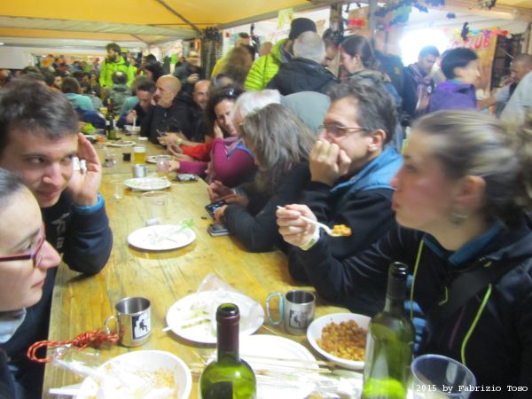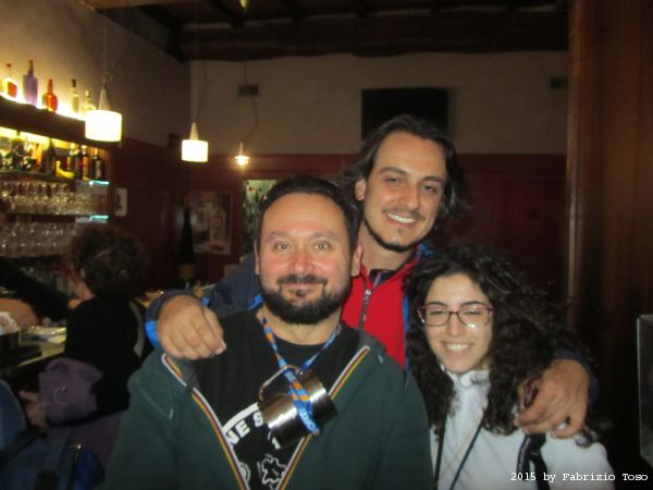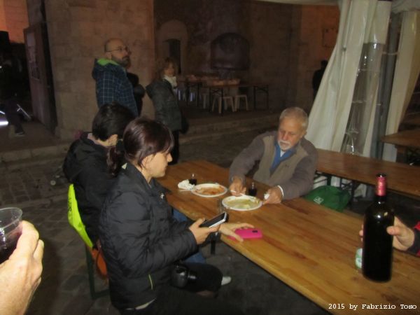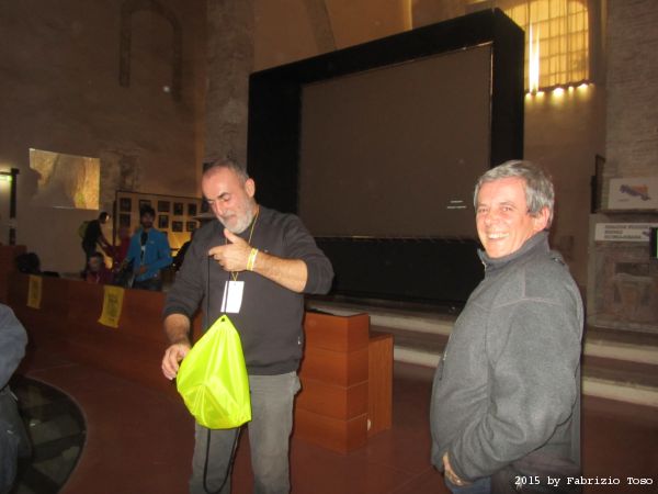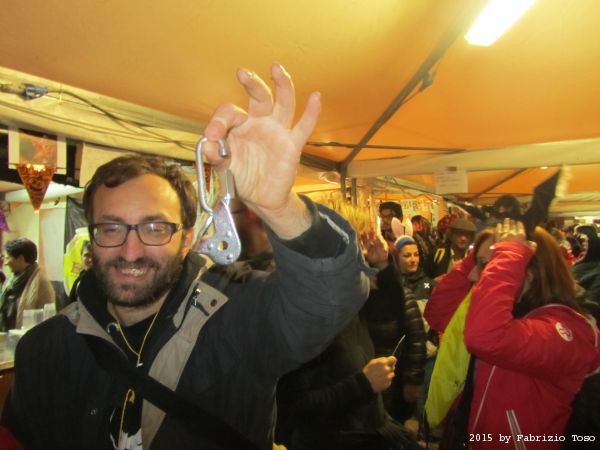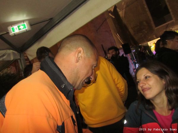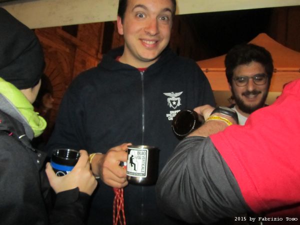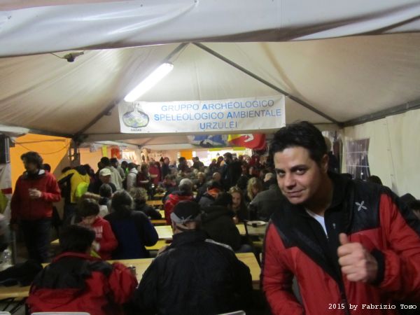Dopo il doveroso seppur triste momento in ricordo di un amico non piu’ tra noi, ci avviamo mesti verso lo speleobar. La confusione e l’allegria del luogo dilava lentamente la tristezza. Uno storico incontro, Simone e Cristiano, finora si erano frequentati solo tramite social network, conoscersi de visu e’ decisamente meglio. Suggelliamo l’incontro con un brindisi.